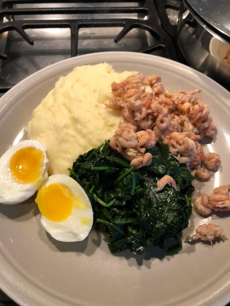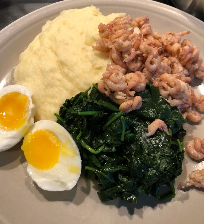 PUREE AU LAIT BATTU, CREVETTES GRISES, EPINARDS FRAIS ET OEUF (MOLLET)