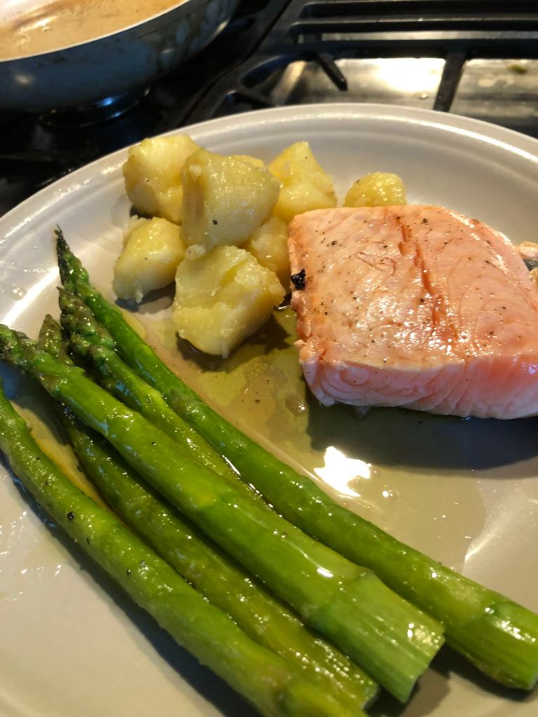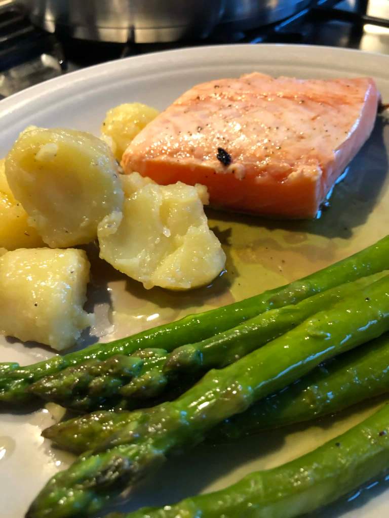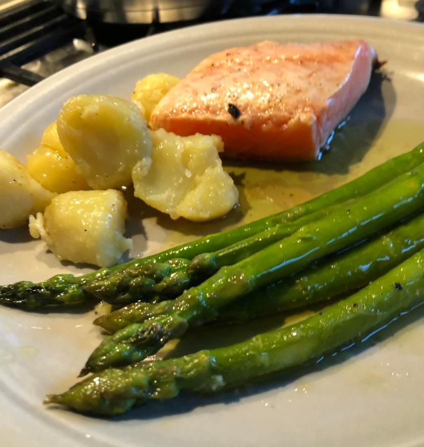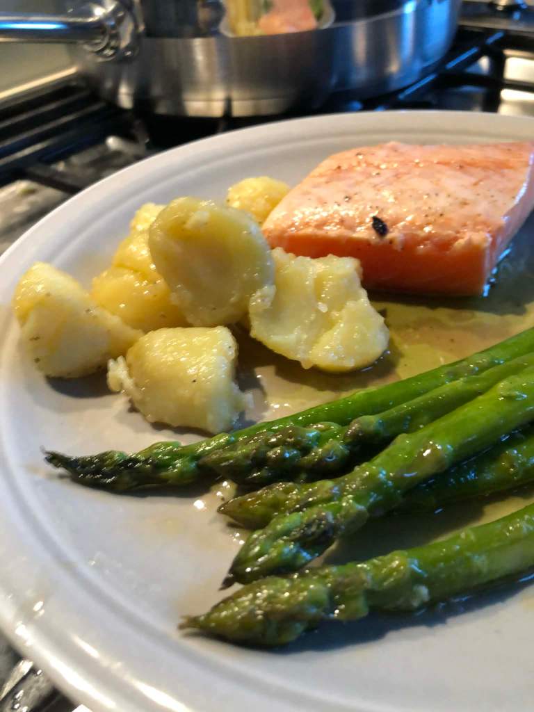 Saumon en basse température au vadouvan, asperges vertes et vinaigrette à la coriandre façon Eric Fréchon , pommes de terre à l’huile d’olive et au bouillon