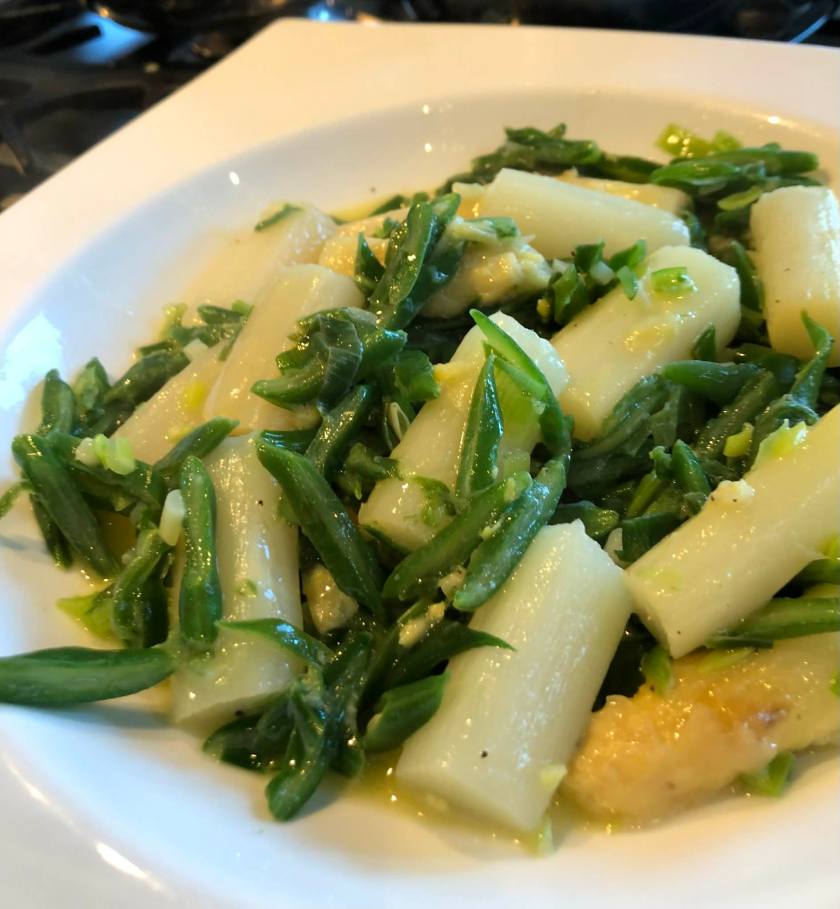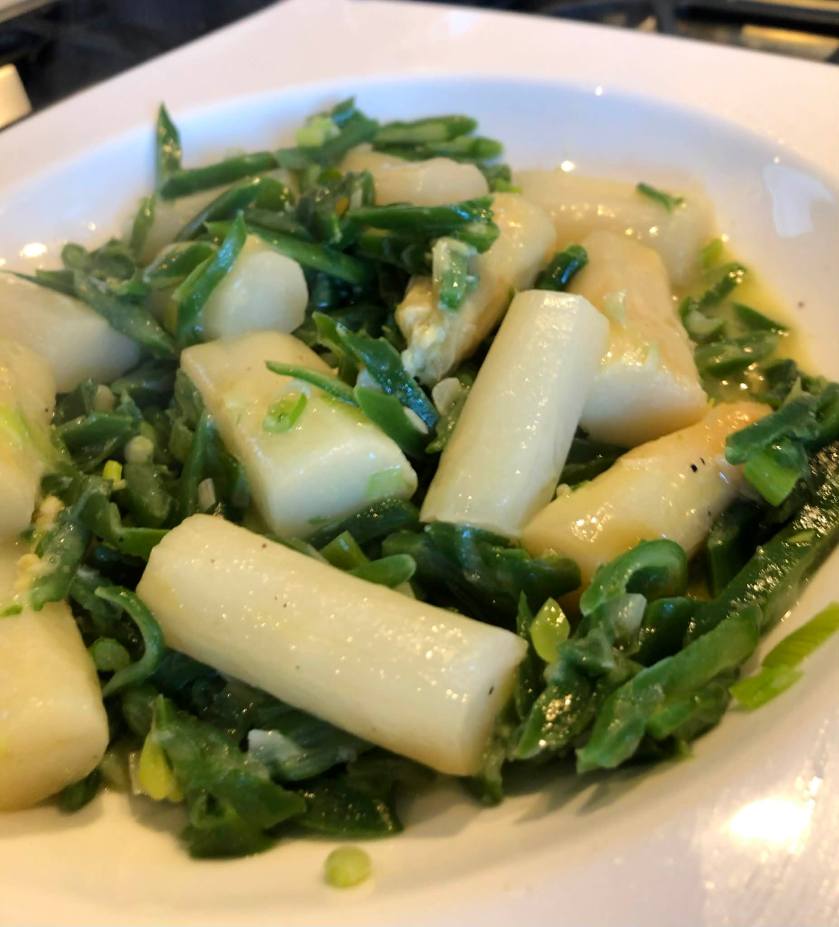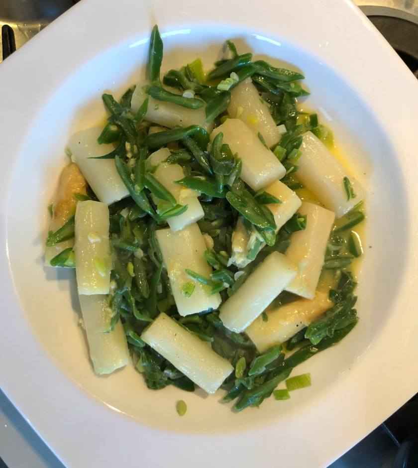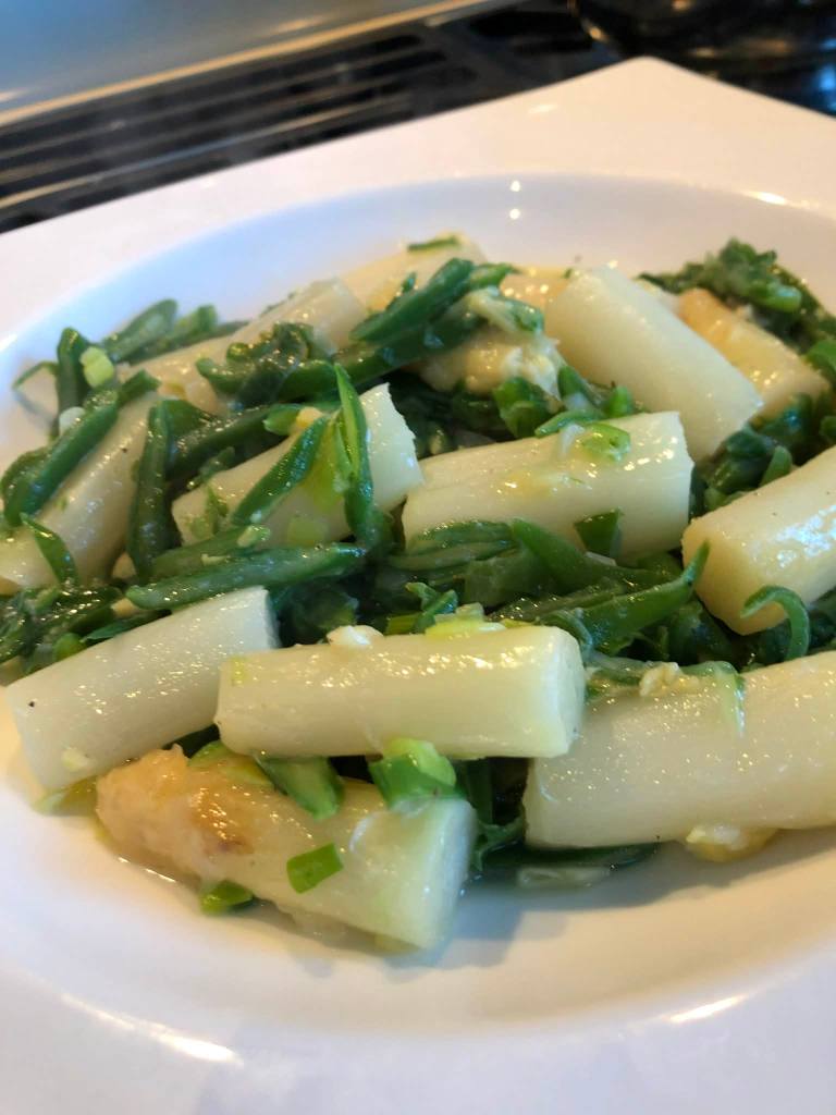 ASPERGES BLANCHES ET HARICOTS A COUPER, SAUCE FACON CARBONARA MAIS A L’ANCHOIS