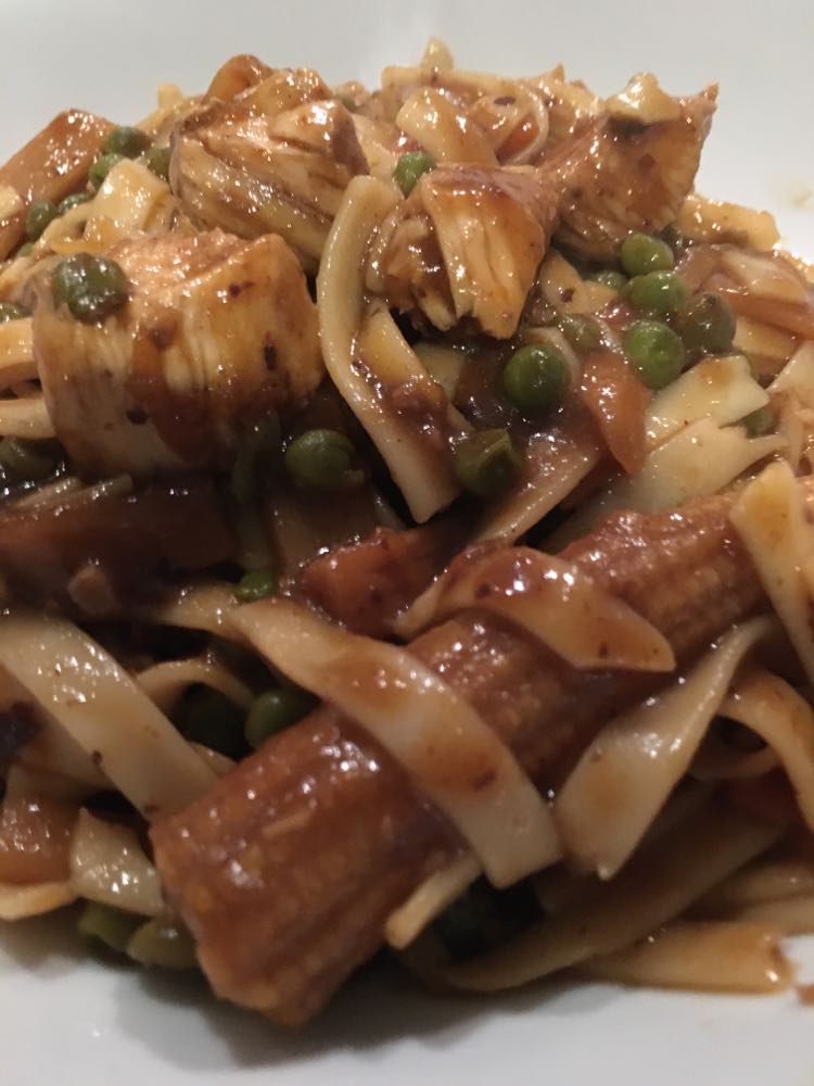 J’ai un rien adapté la recette de Whoogy’s à notre goût personnel avec un peu moins de gingembre et surtout moins d’huile de piment. Ma chérie n’aime pas du tout le pimenté et même ici, en diminuant pas mal, je ne suis pas arrivé à lui faire aimer ce plat. Moi j’ai adoré et je me suis enfilé trois assiettes.