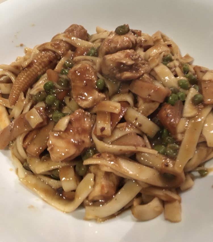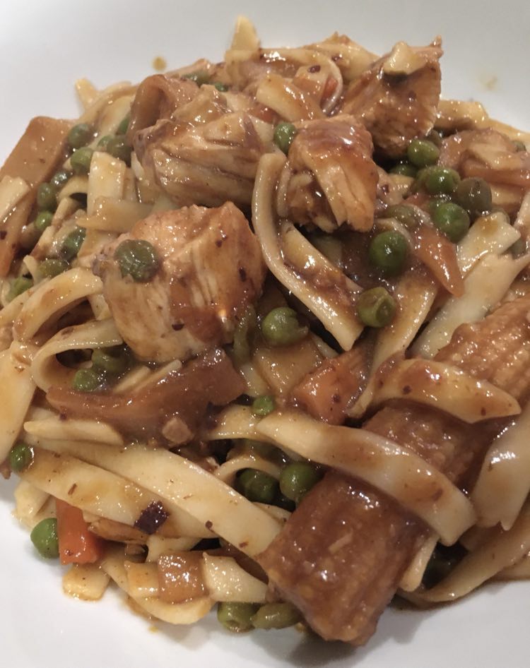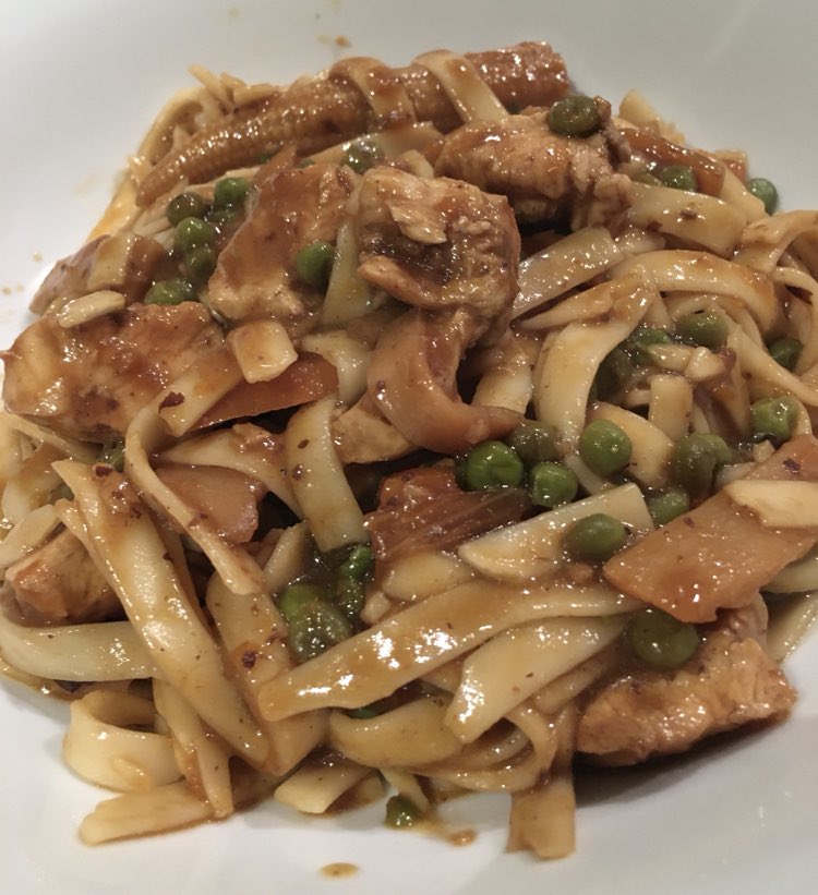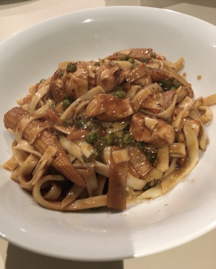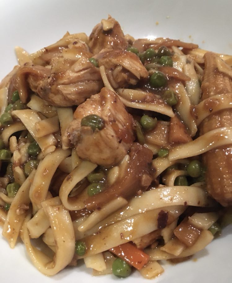 Cette recette est une belle combinaison d’acidité, de sucré, de salé, d’amertume et d’umami, une belle combinaison de textures aussi avec cette viande croustillante, les arachides et le vert des oignons sur la texture moelleuse des pâtes et la sauce plutôt liquide.