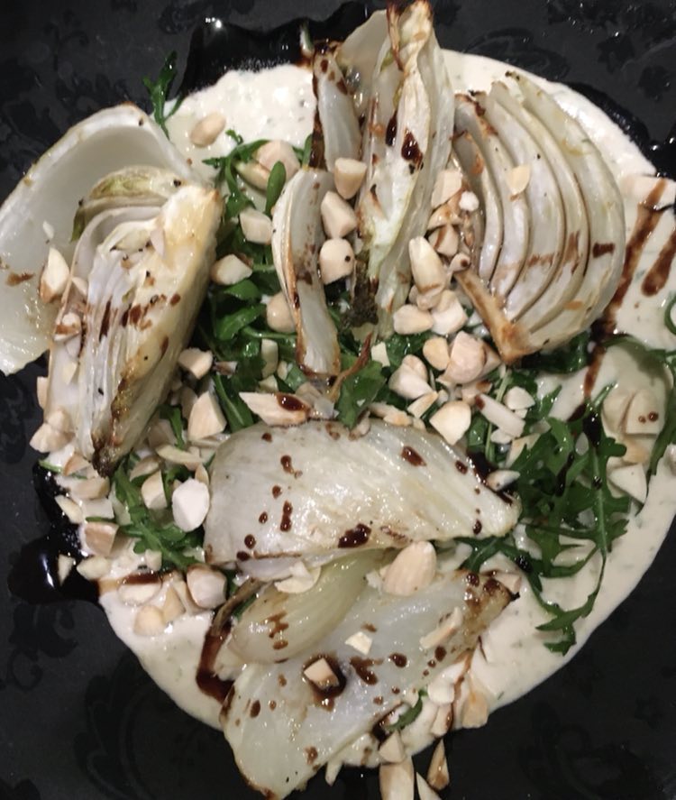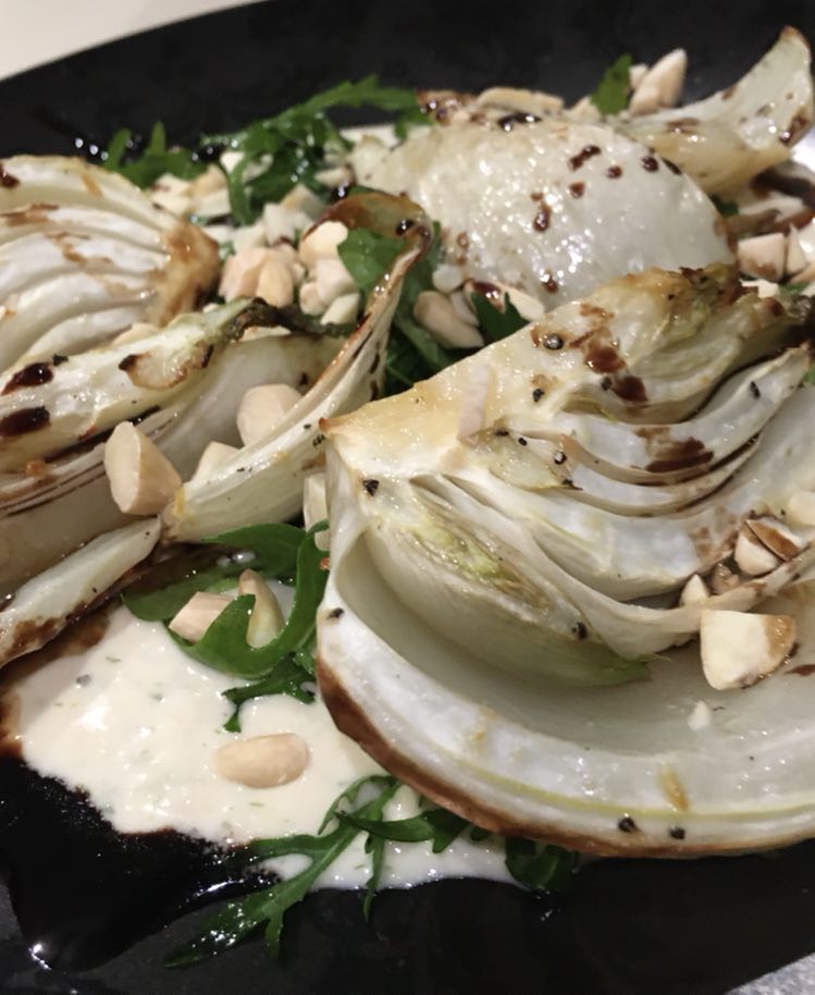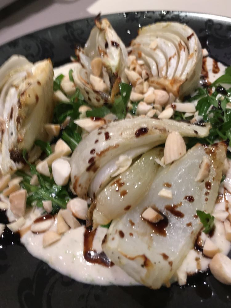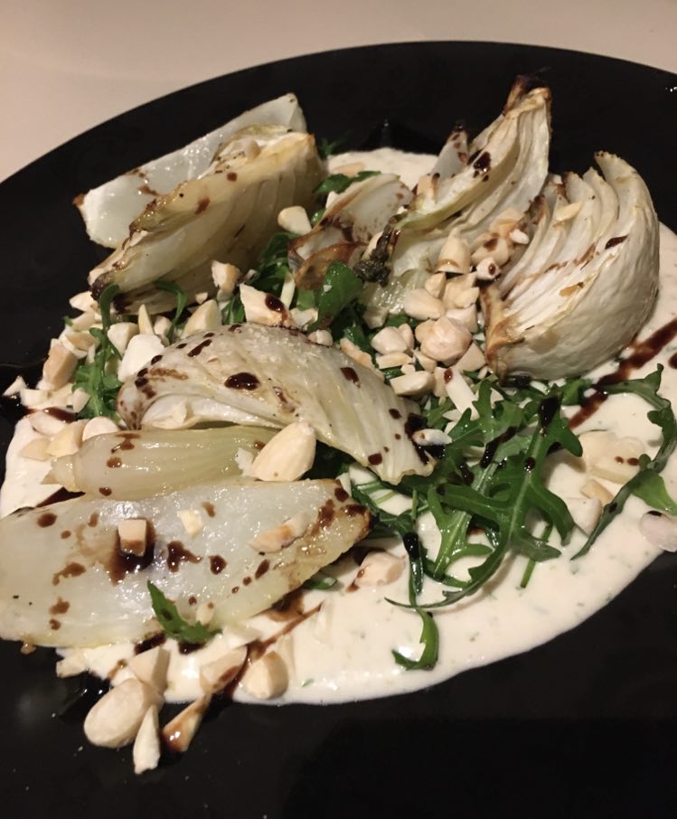 COURGETTES GRILLEES ET OLIVES VERTES A LA VINAIGRETTE AIL-MENTHE, PECORINO ET AMANDES BLANCHES