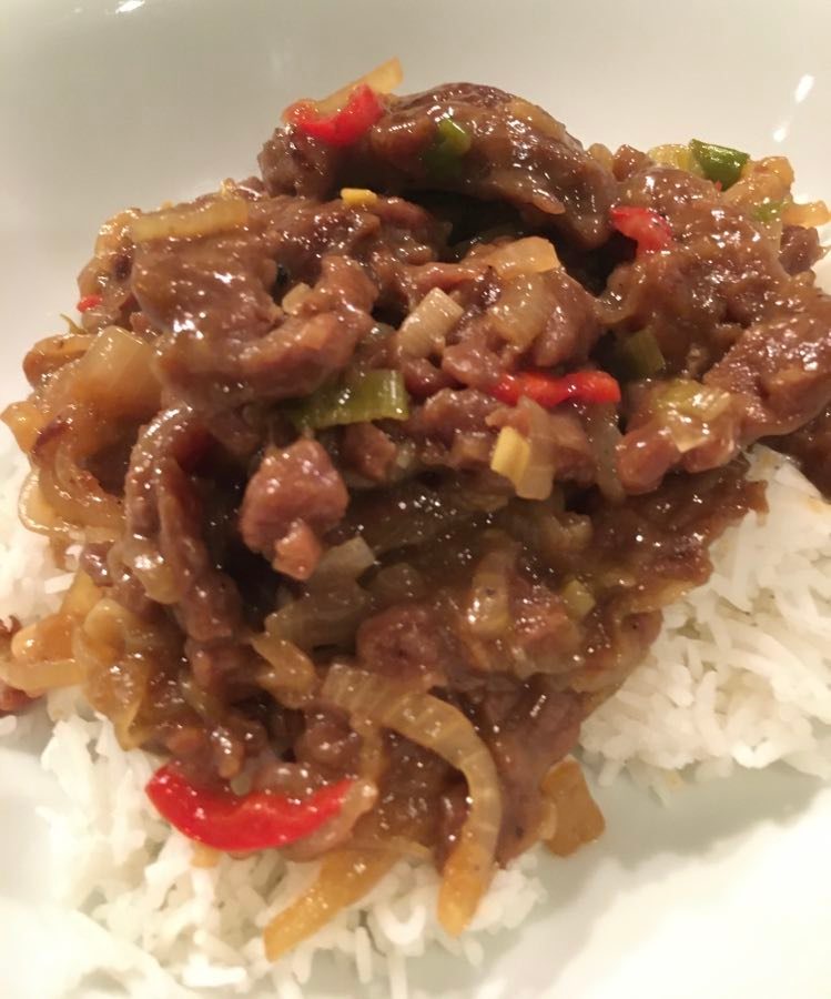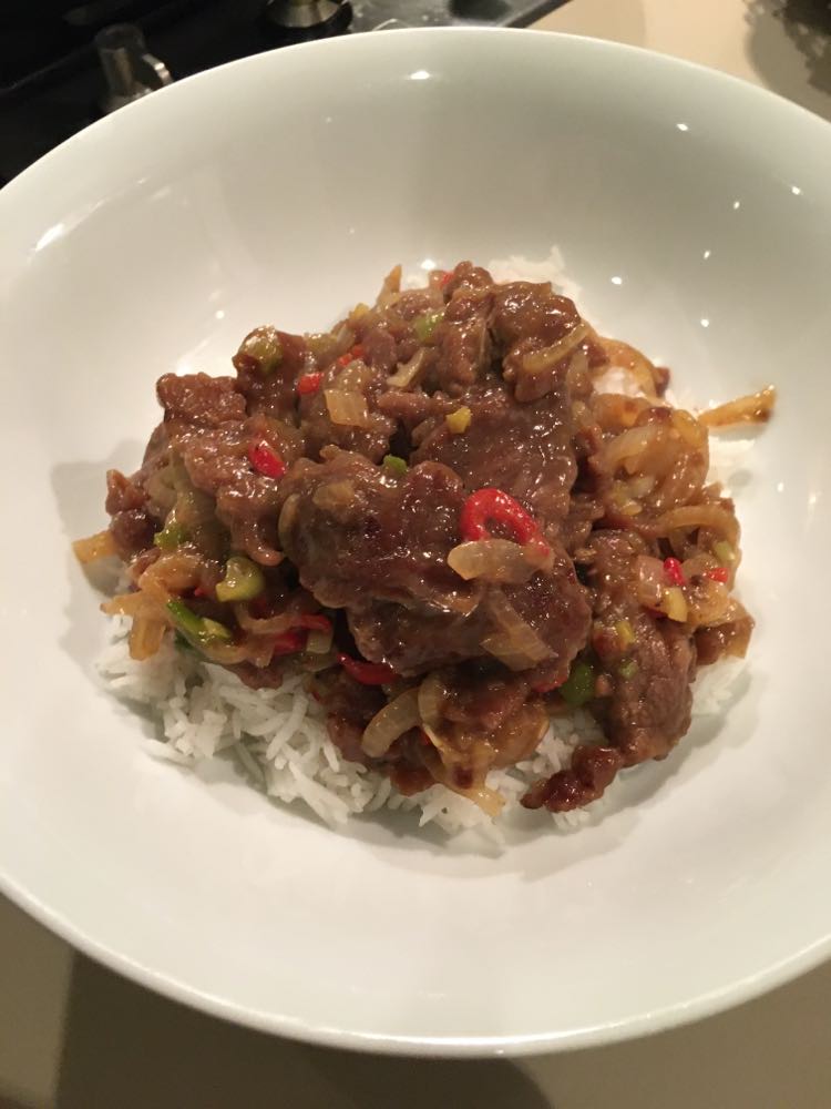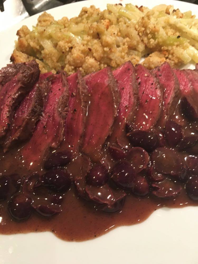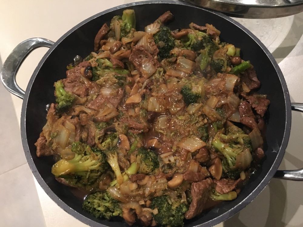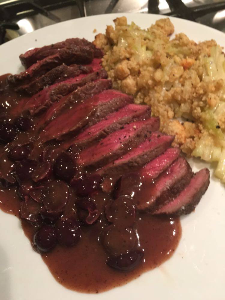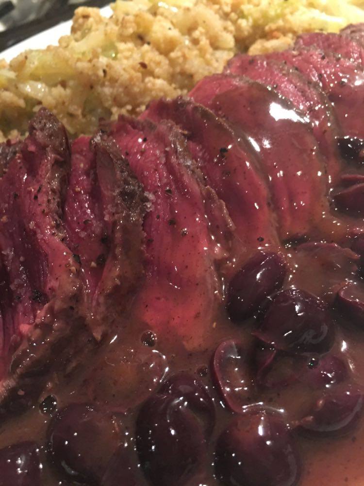 Faire réduire la sauce à feu vif. Bien mélanger le tout et verser la sauce sur la viande. Si jamais la sauce est trop liquide, éventuellement lier à la maïzena, mais en principe cela ne devrait pas être nécessaire.