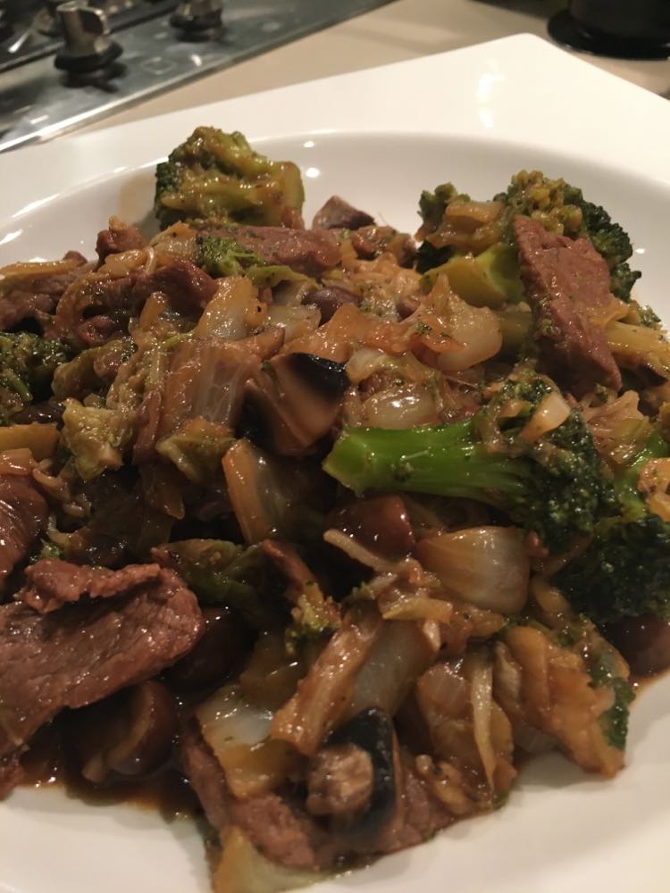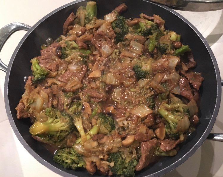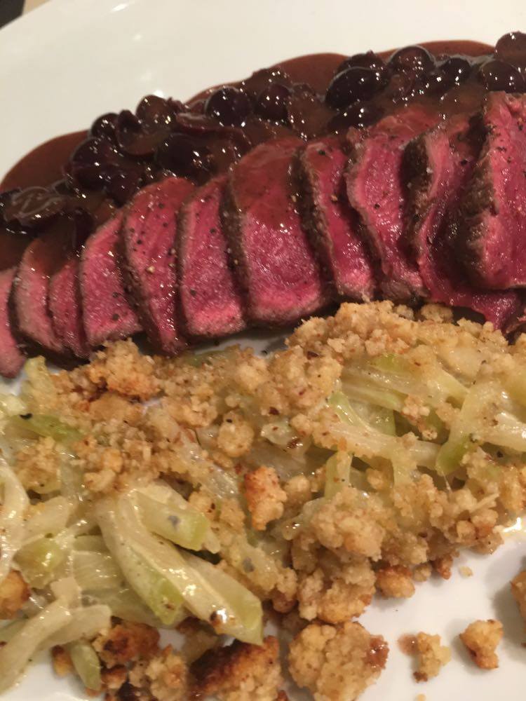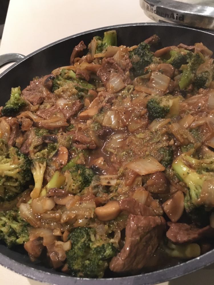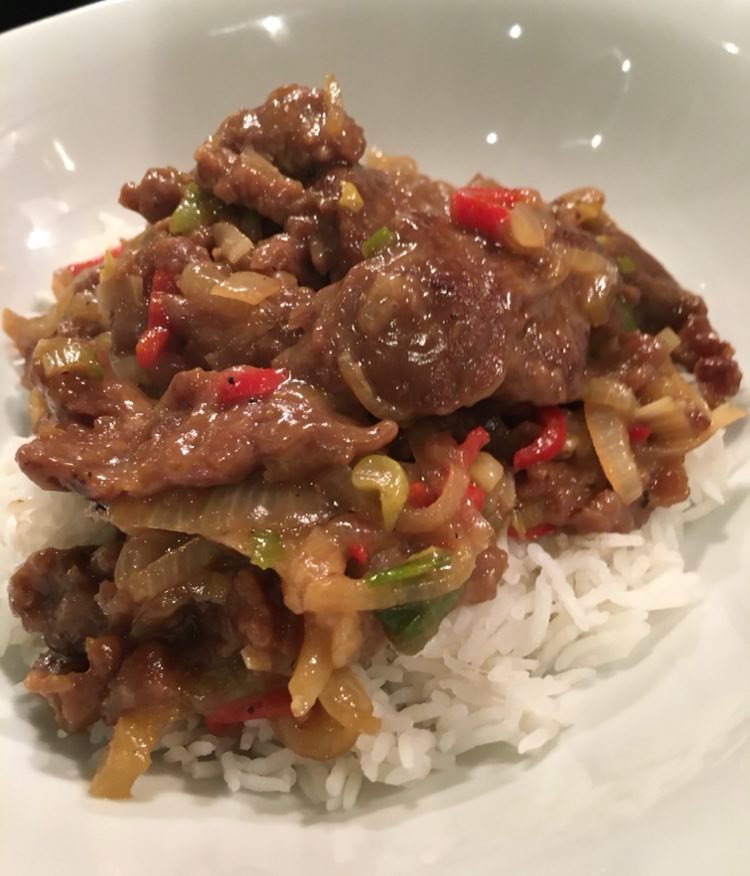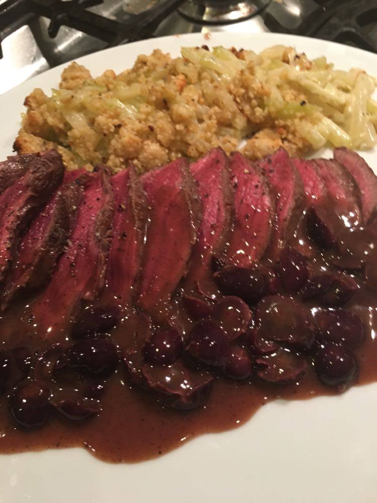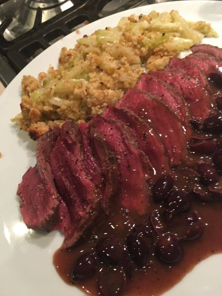 Faire réduire la sauce à feu vif. Bien mélanger le tout et verser la sauce sur la viande. Si jamais la sauce est trop liquide, éventuellement lier à la maïzena, mais en principe cela ne devrait pas être nécessaire.