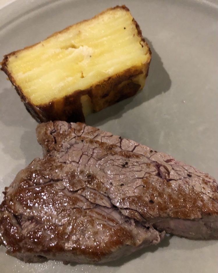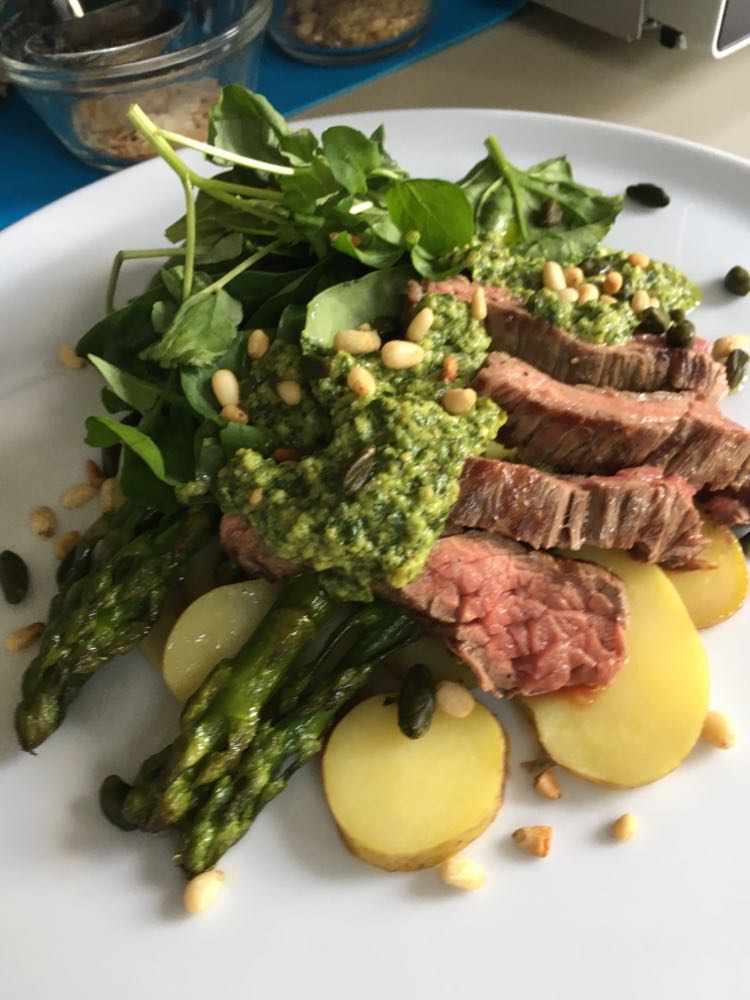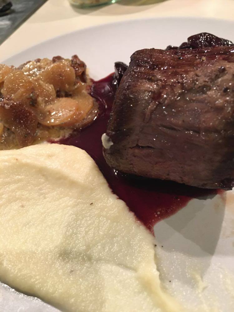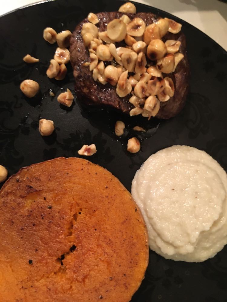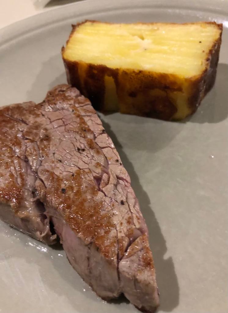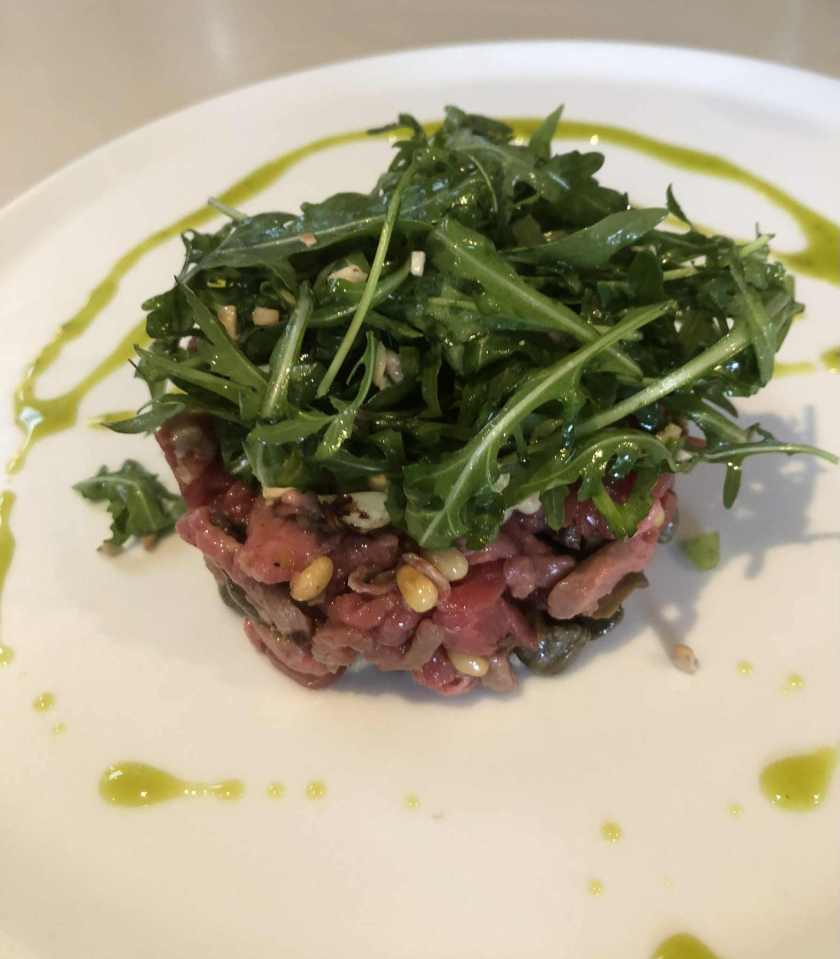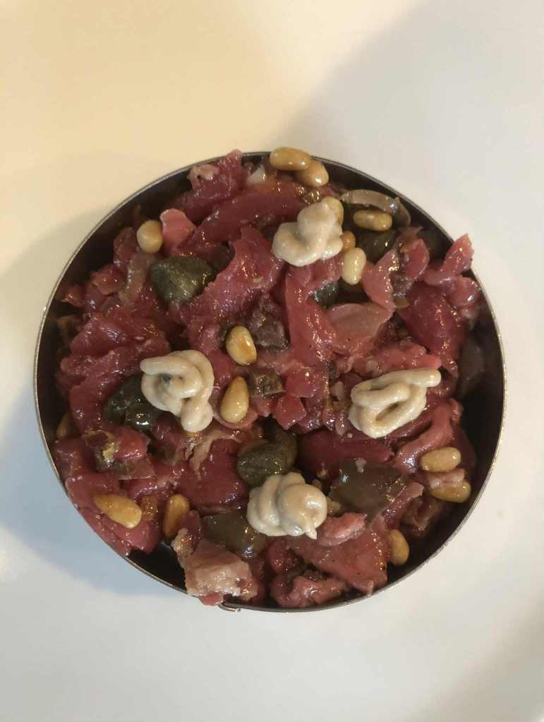 J’ai trouvé qu’il y avait des bonnes idées. Mais déjà quasi pas d’assaisonnement dans le tartare (mais salière et poivrier à table), aucune acidité sur l’assiette (ni citron ni balsamique), quasi pas d’huile d’olive. Manque de punch, pour moi et même le parmesan, pour celles et ceux qui aiment ça dans un tartare, on pouvait compter les copeaux avec les doigts d’une main. J’ai mélangé tout ce qu’il y avait sur mon assiette et assaisonné et j’ai toujours trouvé ça pauvre en goût. Heureusement qu’il y avait en-dessous du parmesan, ce petit peu de purée d’anchois (même si je ne l’ai pas trouvé assez forte en goût).