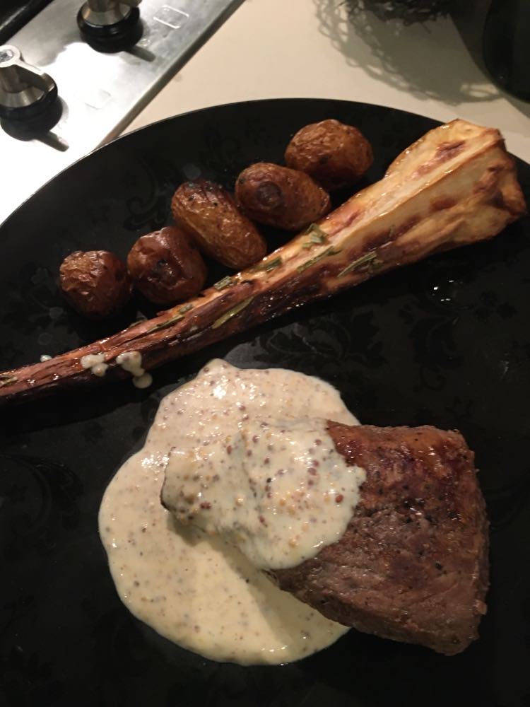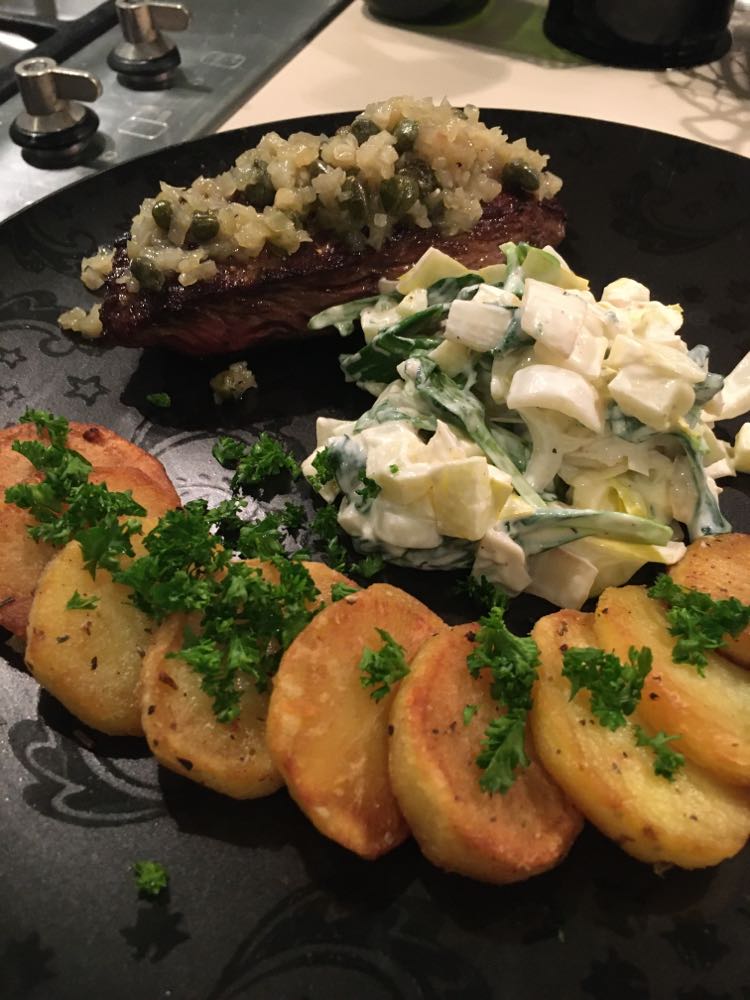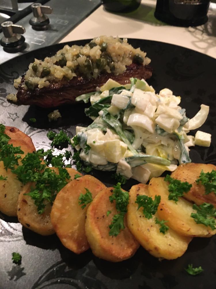 Encore un grand classique de la cuisine belge. Ici dans ma version préférée, un peu sucré-vinaigré avec du spekuloos, du pain d’épices, de la moutarde, de la cassonade et du vinaigre balsamique, et naturellement la geuze, qui reste pour moi la meilleure bière à utiliser pour ce plat. Avec d’autres bières le goût est très vite trop amère pour moi. Il faut naturellement prendre une bonne gueuze, une Boon, une Drie Fontijn, une Girardin ou une Cantillon. Depuis peu je mélange geuze et Westmalle double en 2/3-1/3 et je préfère encore plus. Cela dépend de vos envies. On peut jouer avec le sucré, le vinaigré, le piquant… comme on veut et même encore rectifier à la fin. Il n’y a pas une recette, chaque famille à la sienne, selon ses goûts personnels.