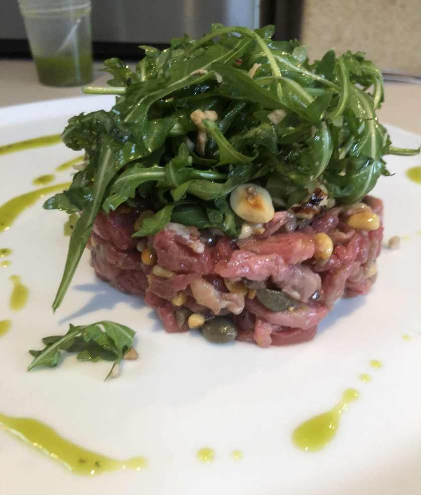300 g de filet de boeuf, sel, poivre, huile d’olive + 25 g de petits câpres et 20 g de mostarda de fruits. Sur le tartare : 100 g stracciatella, 50 g noisettes, 4 filets d’anchois, de la truffe en copeaux, herbes et 5 cl de sauce aux anchois. Pour la sauce : faire cuire 3 gousses d’ail dans 200 ml de lait à petits bouillons jusque quand l’ail devient très tendre. Ajouter 50 g d’anchois et cuire jusque quand ça devient crémeux. Mixer pour obtenir une sauce lisse.