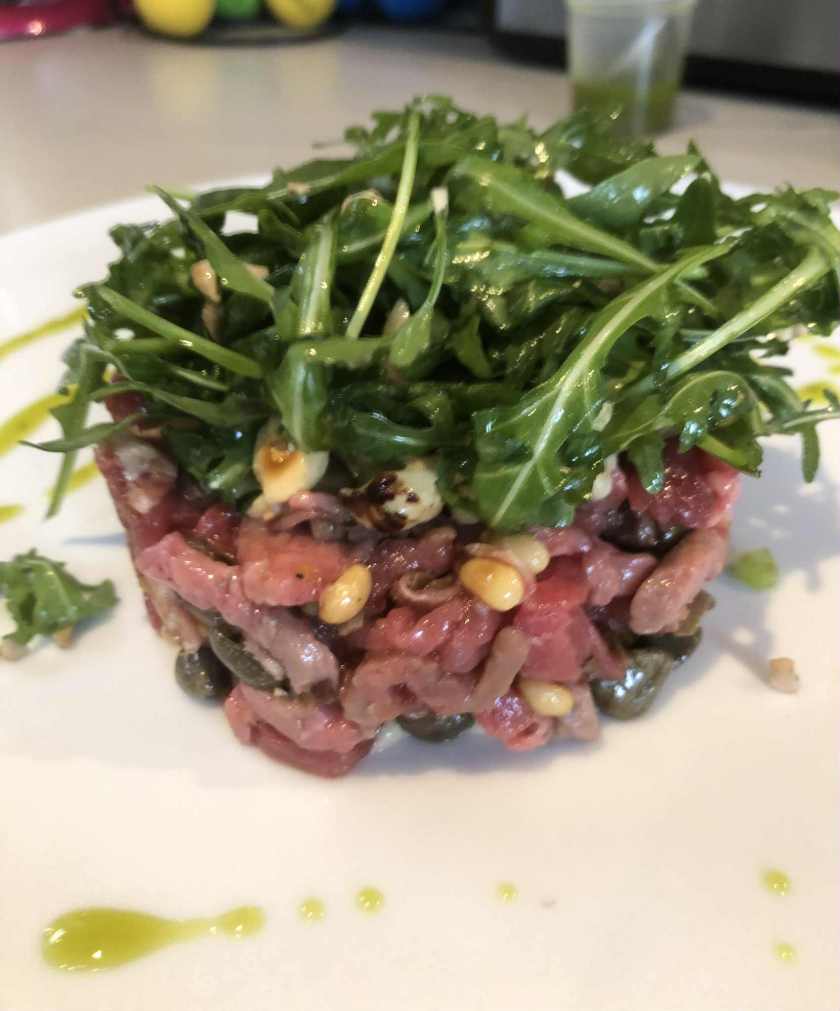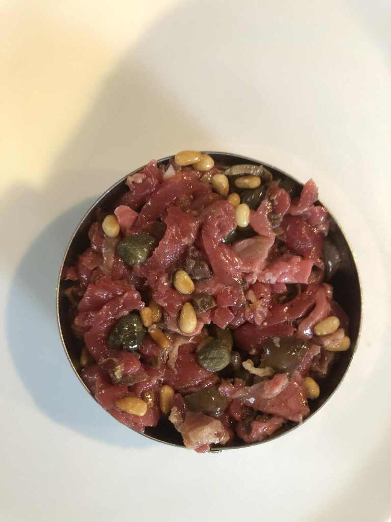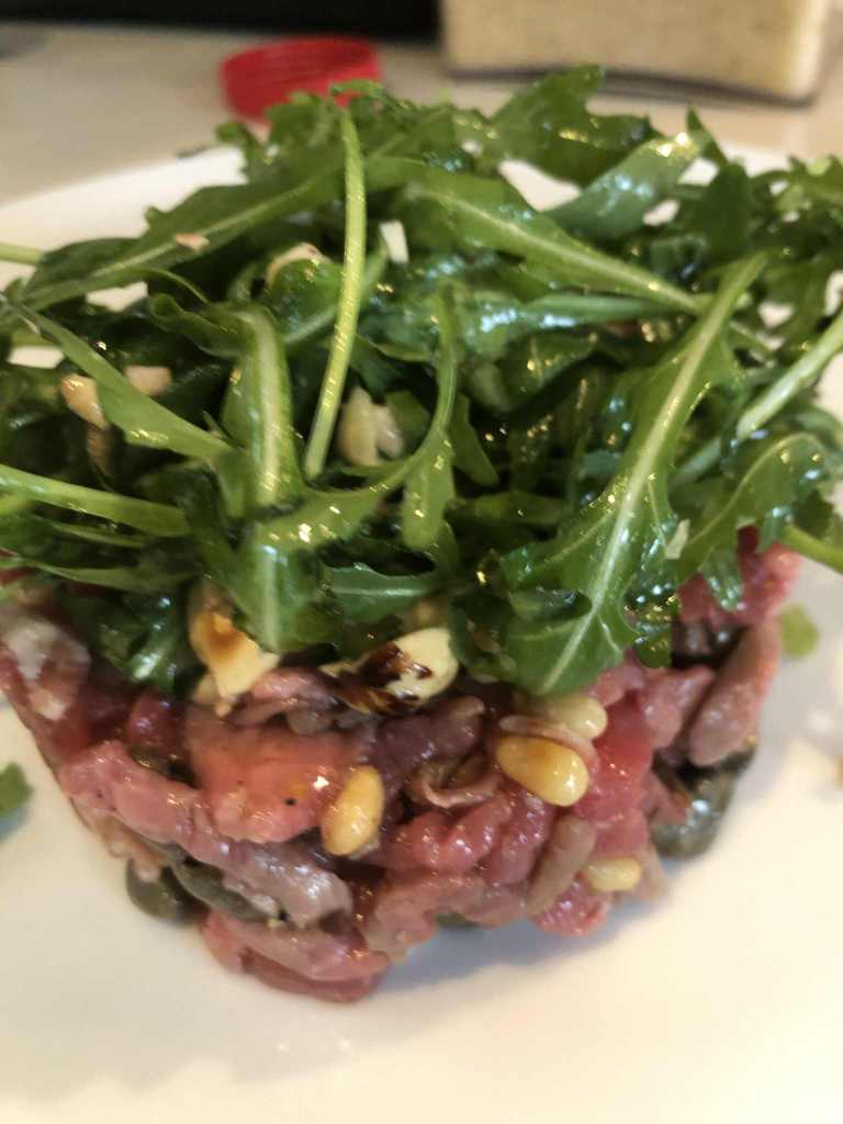 Alors c’est quoi pour vous ‘à l’italienne’ ? Des câpres, des tomates séchées, du pesto au basilic, des olives, du parmesan, de la roquette, de l’huile d’olive, des anchois, du vinaigre balsamique, des pignons, des noisettes, des pistaches, des amandes, du thon, du citron …. Certainement une combinaison, mais laquelle serait la bonne pour vous, laquelle en ferait un ‘tartare à l’italienne’ ?