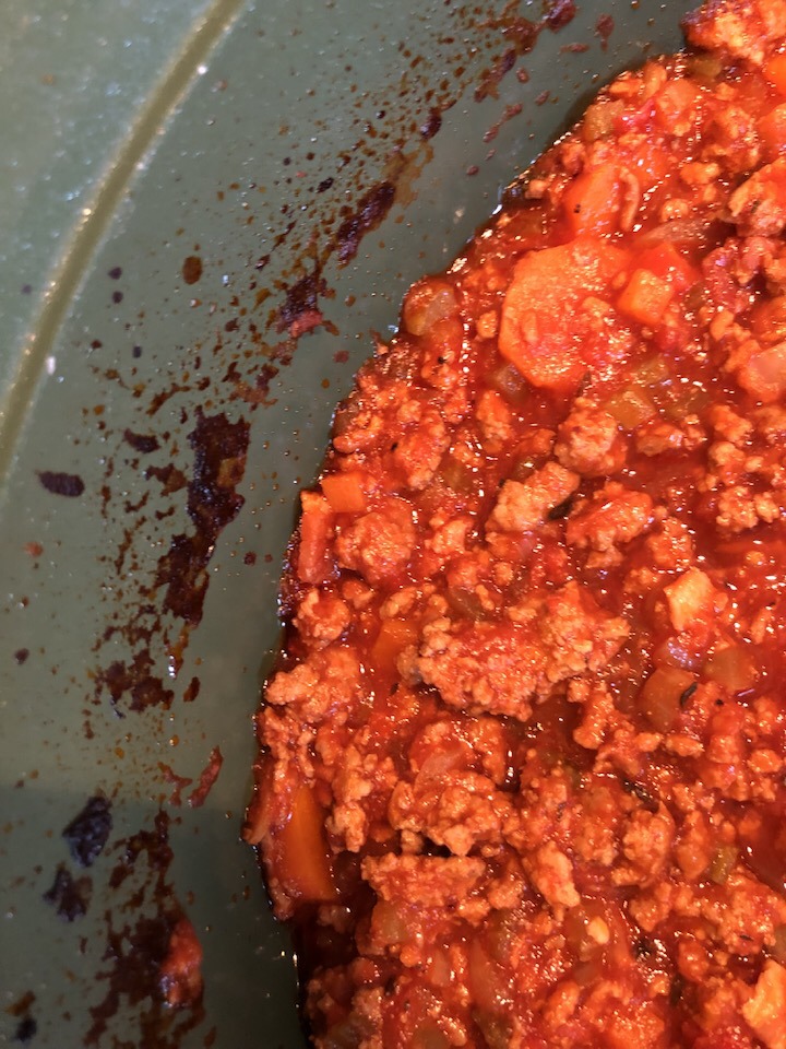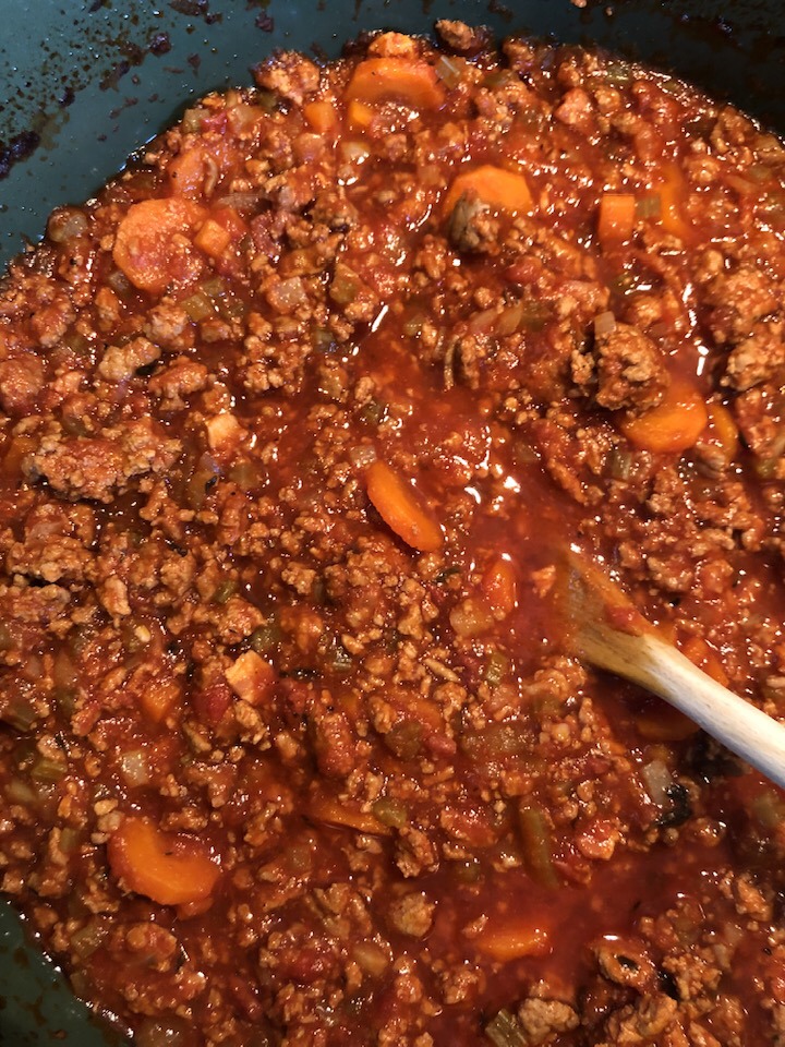 Depuis 2012 j’avais ma petite version de sauce bolo (en cherchant bien on peut la retrouver sur ce blog), mais mon épouse n’a jamais trop aimé ma version car trop de vin et une sauce pas assez épaisse. Je mettais pas mal de bouillon de boeuf dans ma version afin d’accentuer le goût du boeuf, mais j’allais probablement un poil trop loin. J’ai adapté pas mal et contrairement à avant (un fils qui quand il était petit n’aimait pas les morceaux de légumes dans la sauce), je ne mixe plus la sauce. J’ai diminué également un peu la quantité de vin. J’ai donc cette nouvelle version de ma base. Je me devais de la réétudier vu que c’est un peu le plat favori de ma chérie.