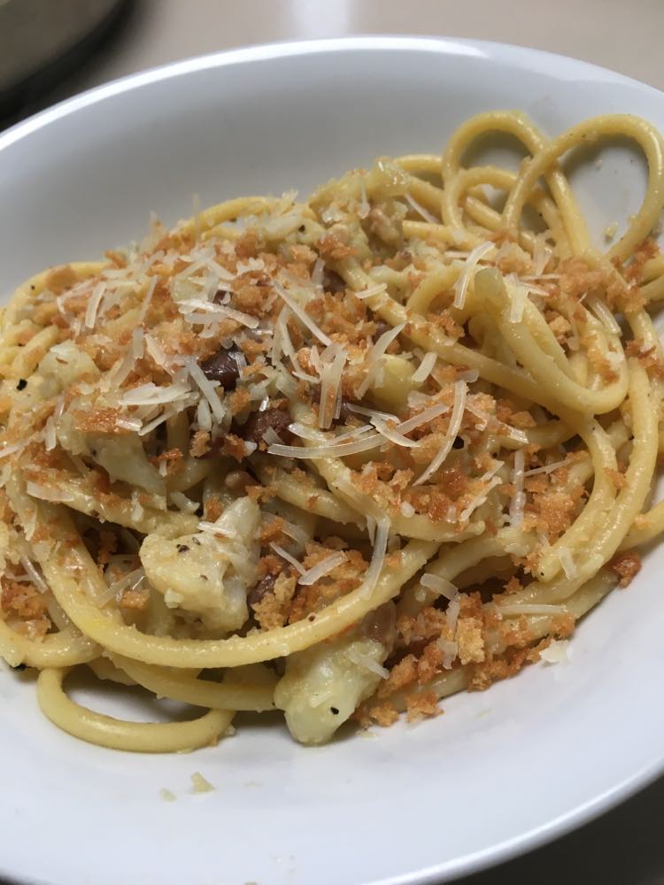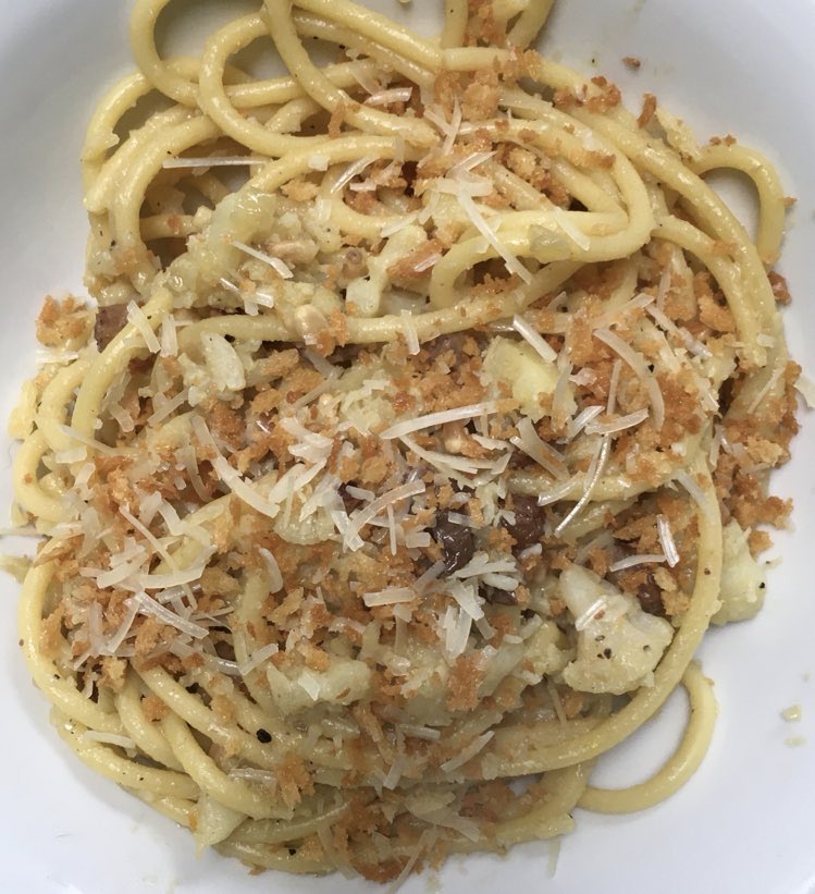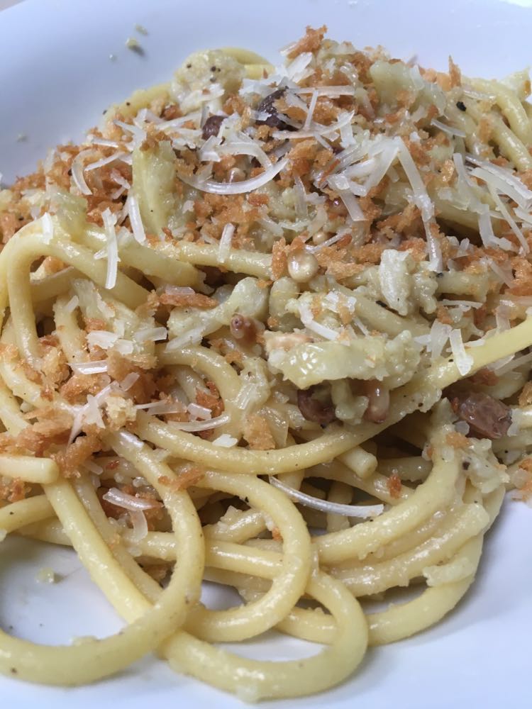 Cette recette combine le chou-fleur avec des ingrédients très traditionnels en Sicile, des ingrédients exotiques : raisins secs, safran, pignons de pin. Et biensûr l’anchois et la traditionnelle chapelure grossière maison qui remplace souvent le fromage râpé dans la cuisine sicilienne et qu’ils appellent pangrattato. Ce type de cuisine nous rappelle le temps ou les arabes et d’autres colonisateurs de l’époque, étaient les maîtres dans cette région. Surtout la région autour de Palerme aura gardé des traces jusqu’à ce jour dans leur cuisine.