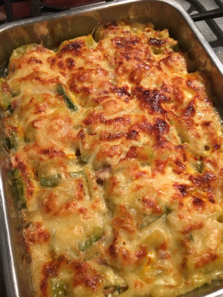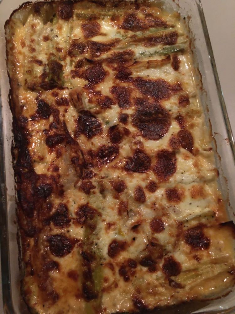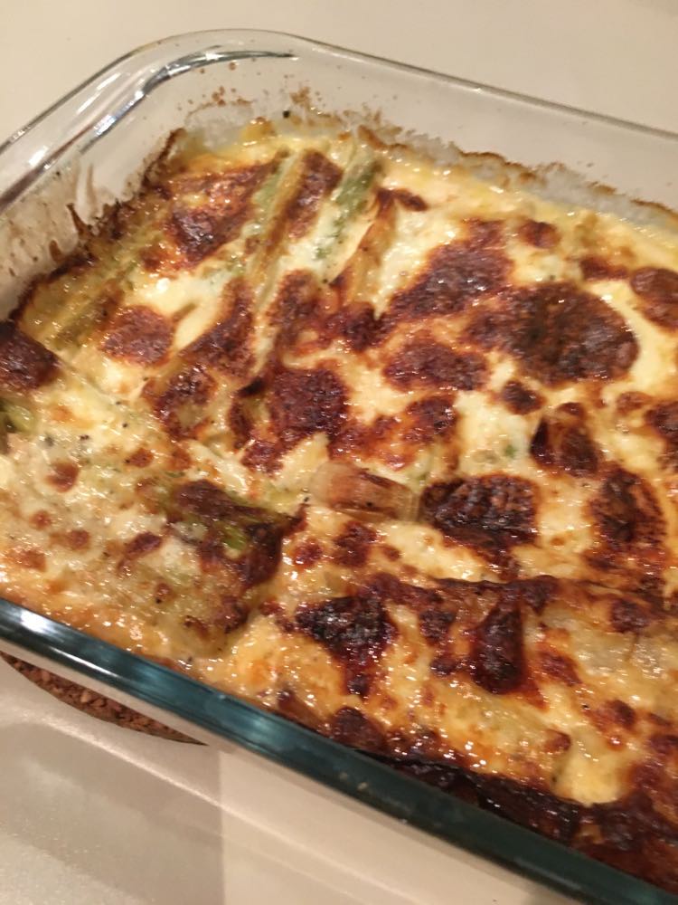 Gratin de poireaux au comté et lard grillé au vinaigre de cidre