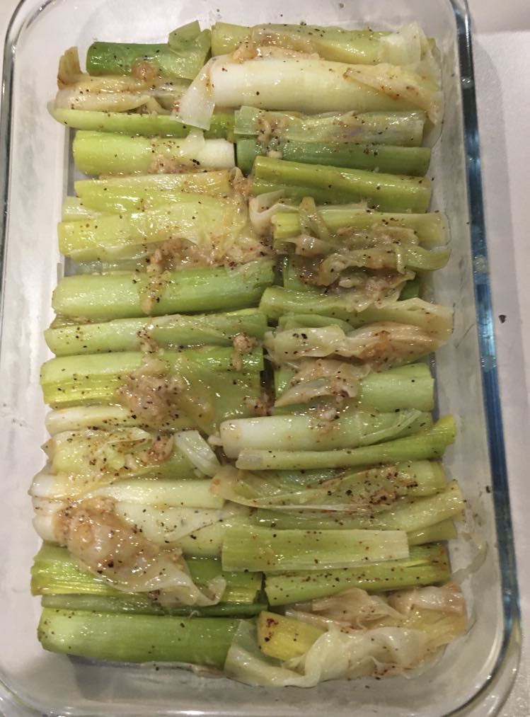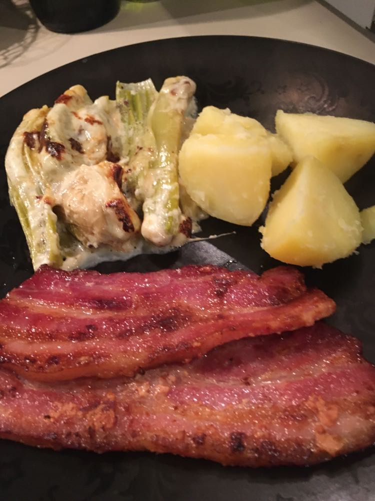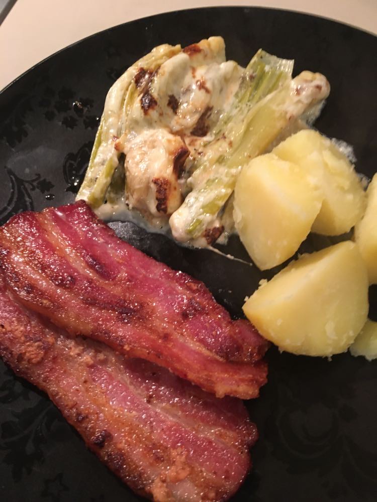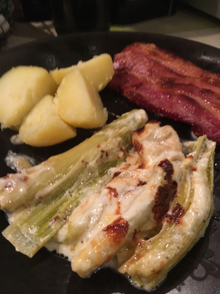 GRATIN DE POIREAUX AU COMTE ET LARD GRILLE AU VINAIGRE DE CIDRE