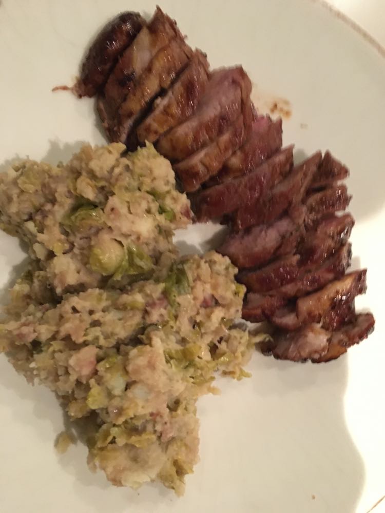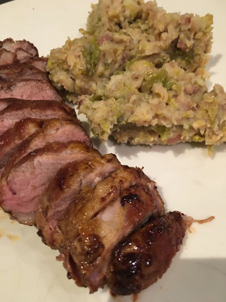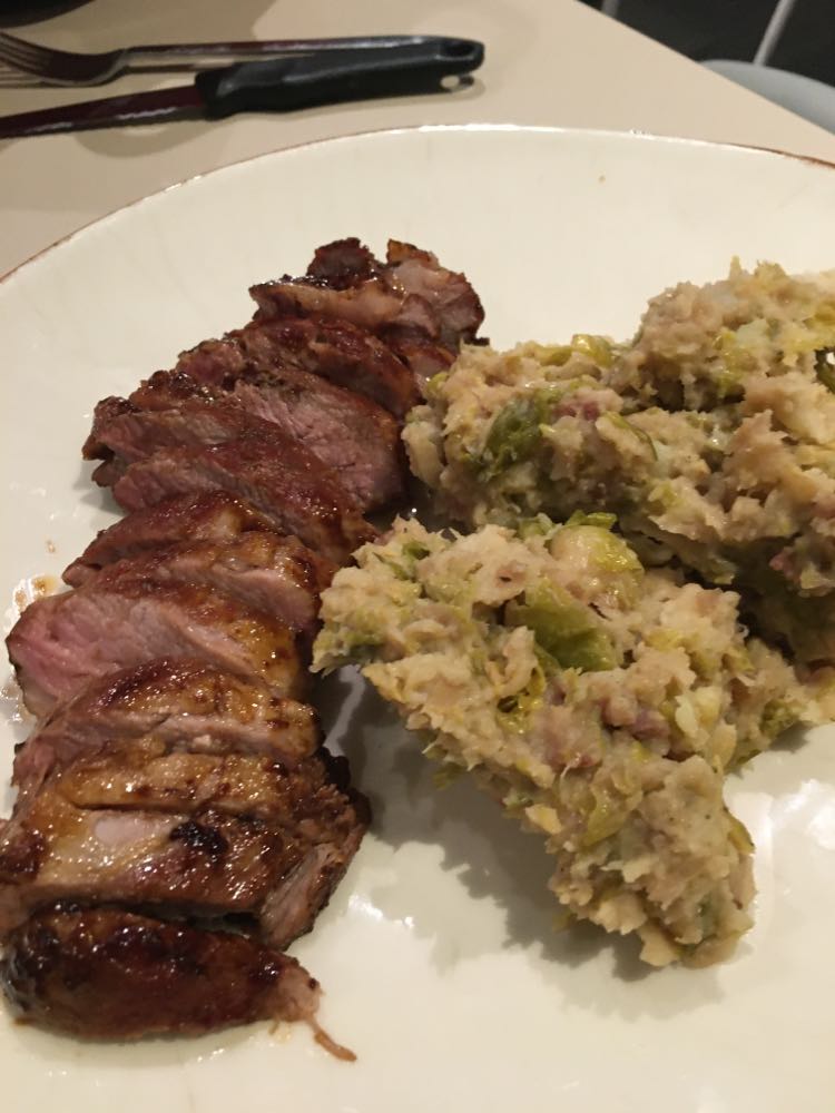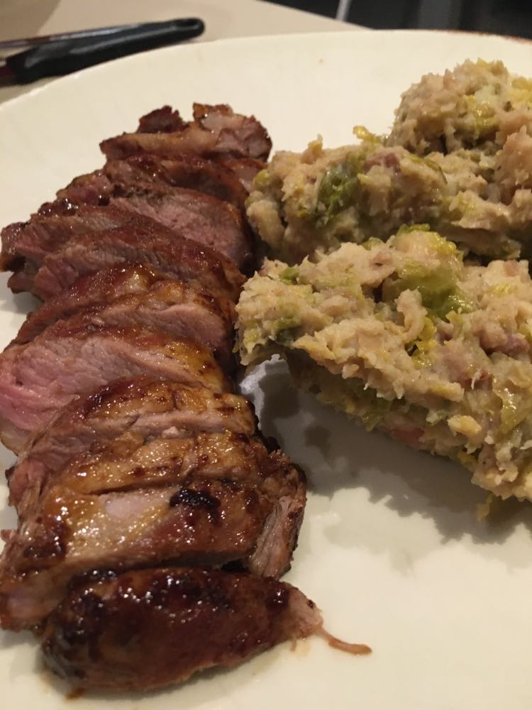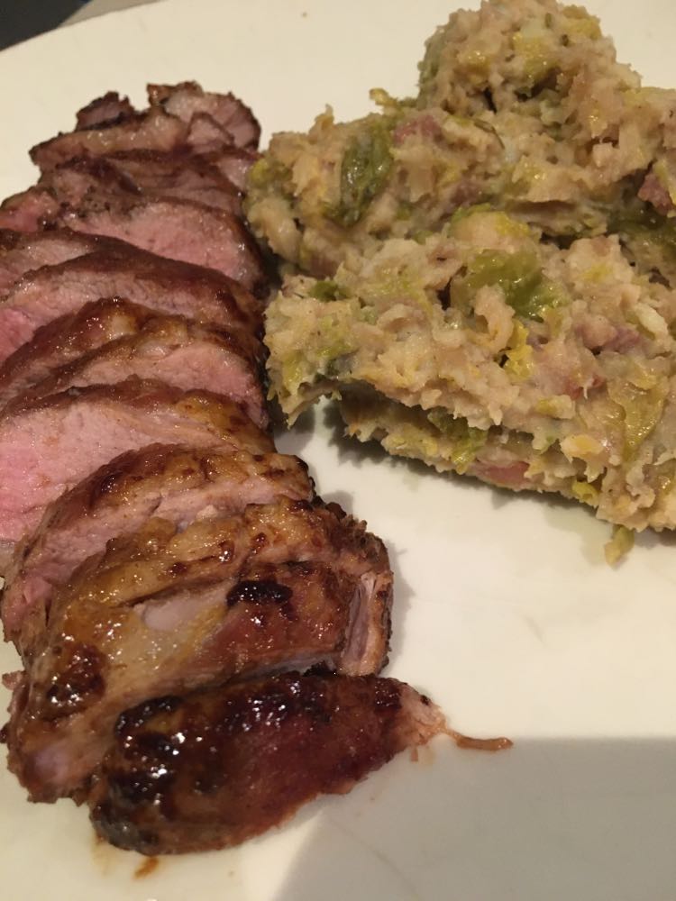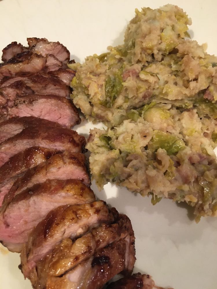 Pluma de porc ibérique laquée, stoemp aux choux de Bruxelles
