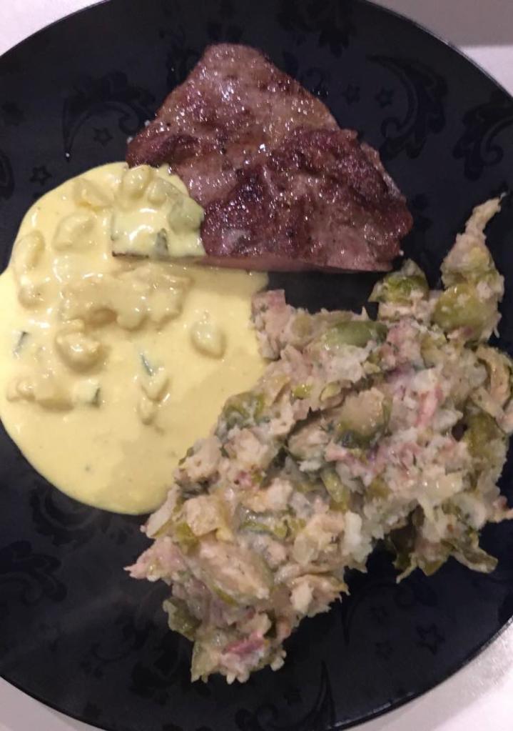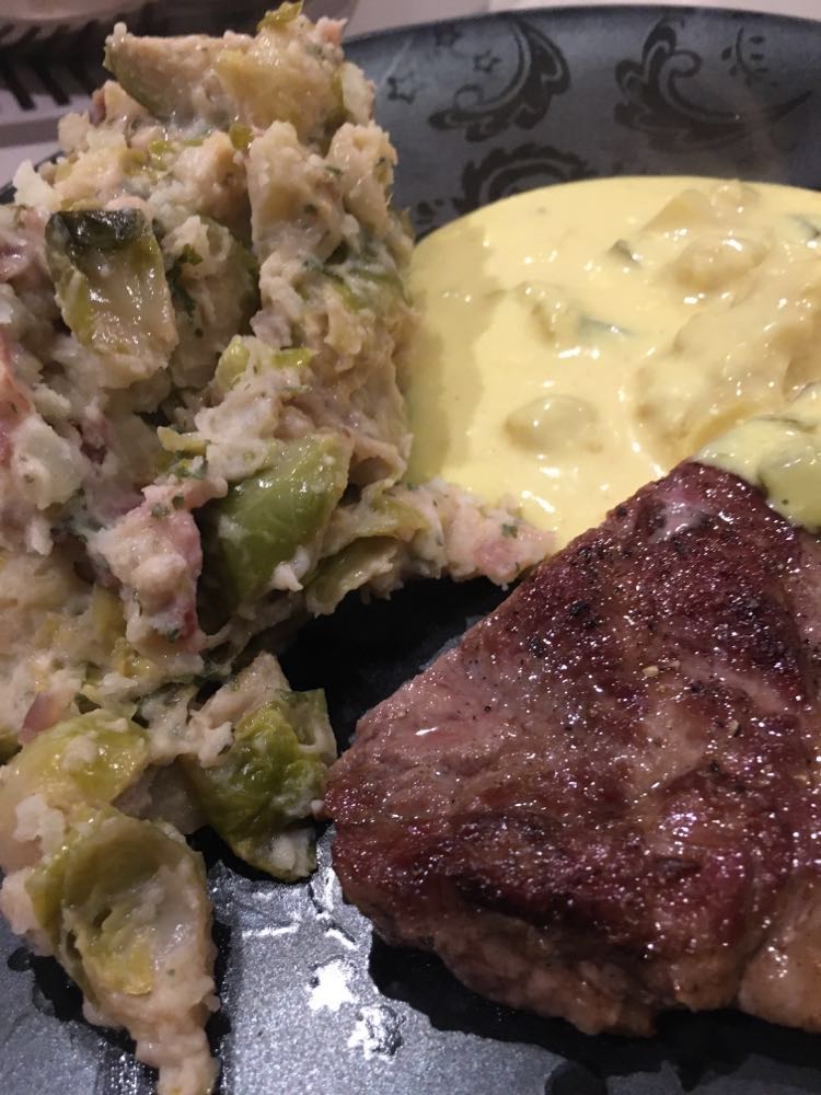 Presa, stoemp aux choux de Bruxelles et sauce cross & blackwell