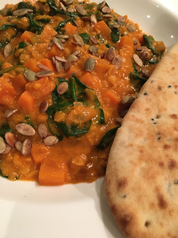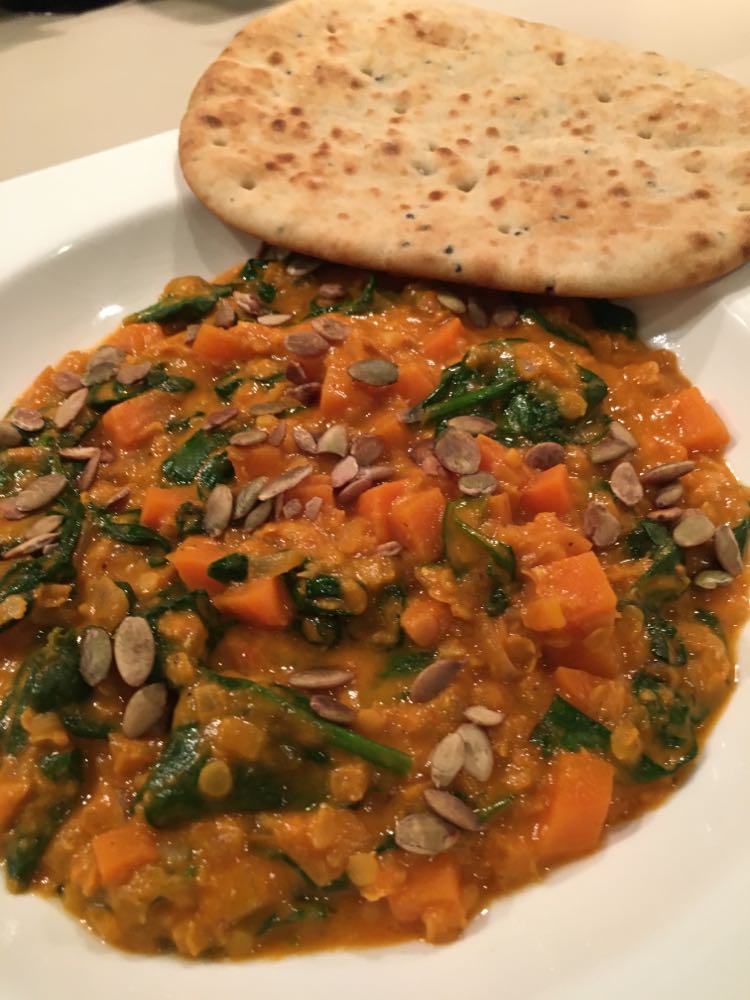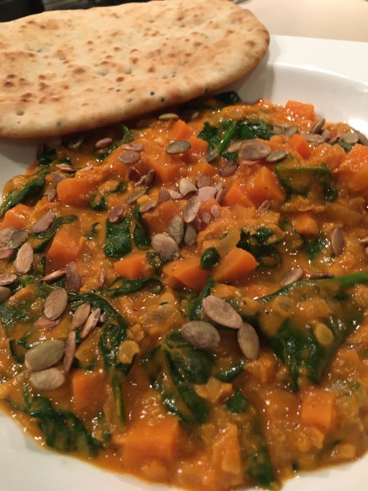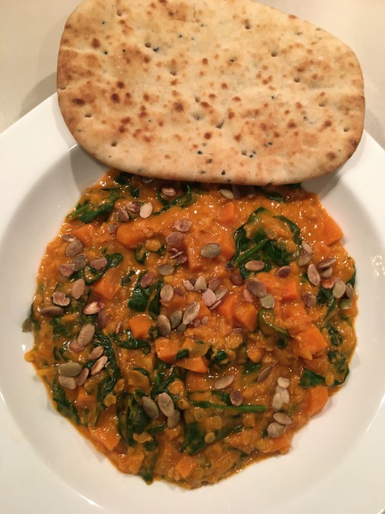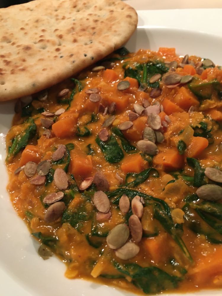 EPINARDS FRAIS, CHOU-FLEUR ROTI, OIGNON ROUGE MARINE ET SALSA AUX CACAHUETES