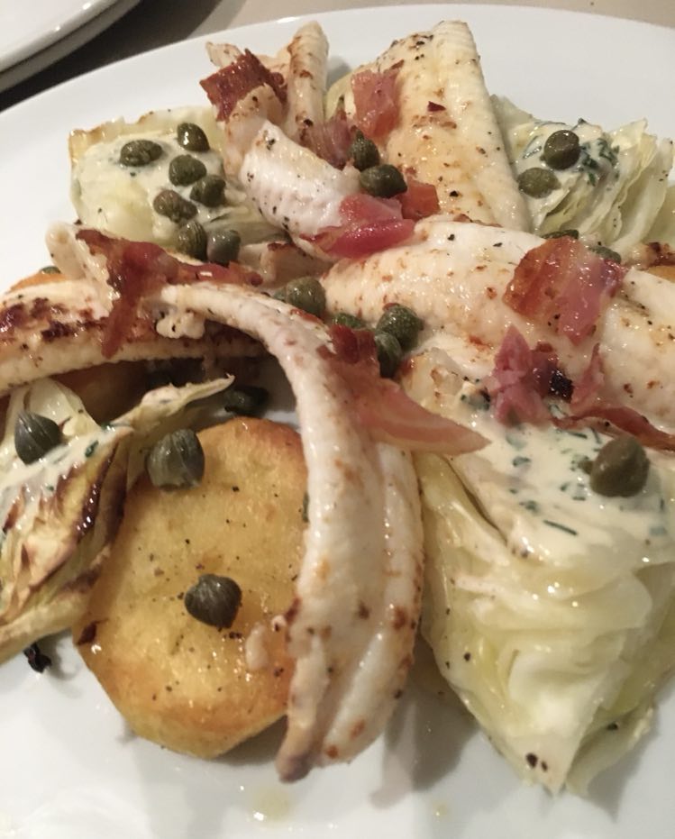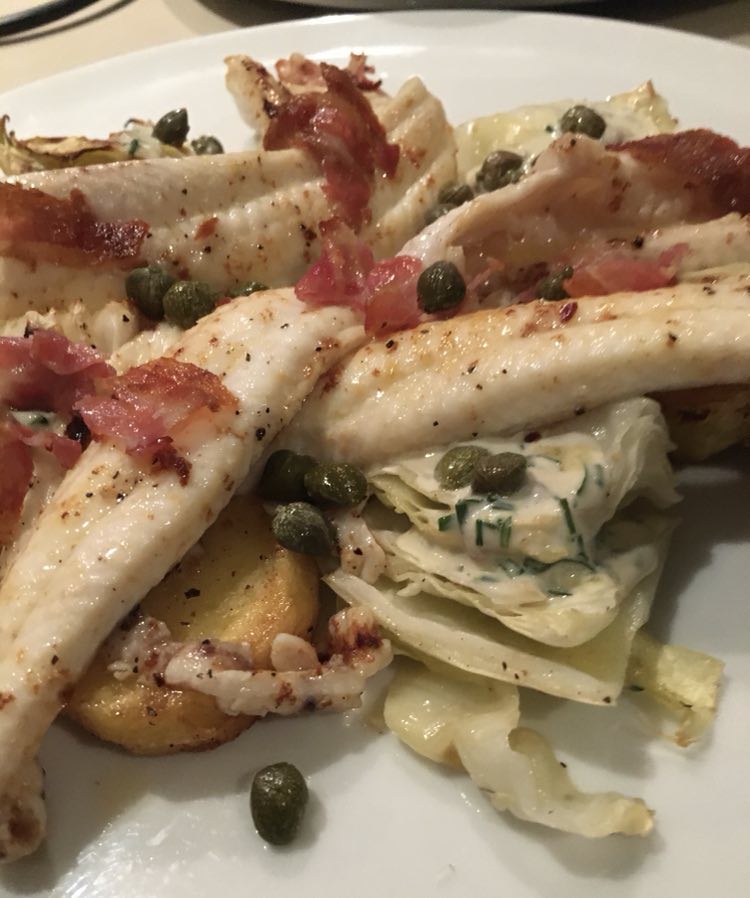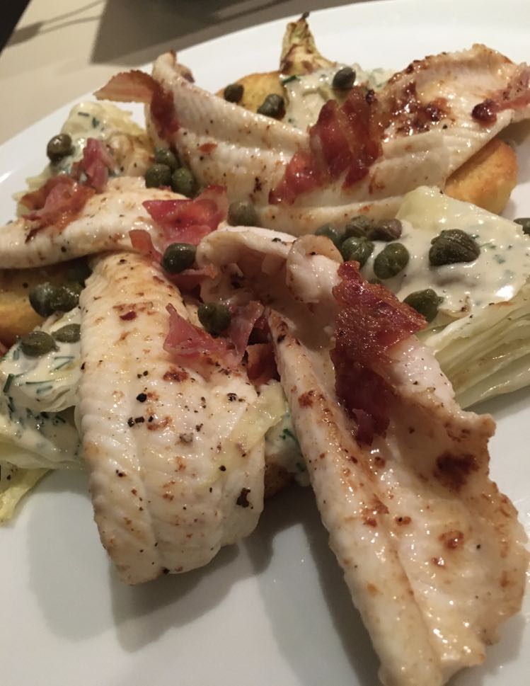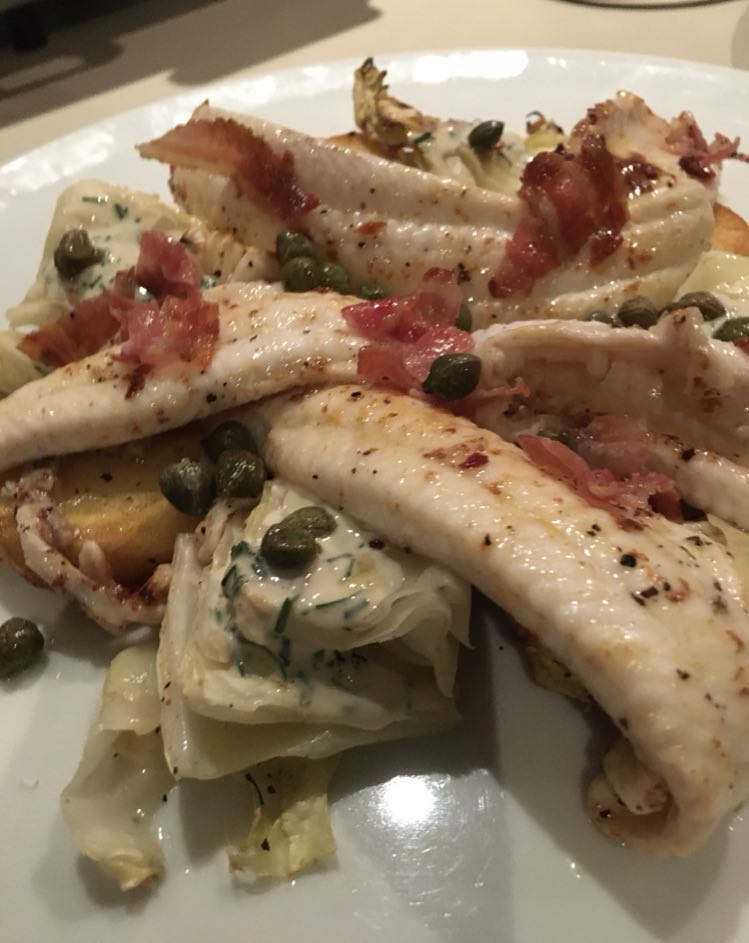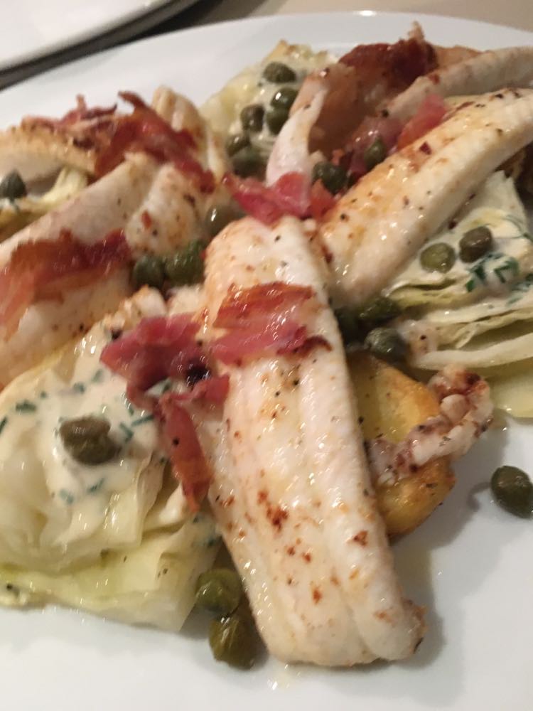 J’ai adoré. La douceur du chou pointu, réhaussé par ce dressing aux anchois, qui fait un peu penser au dressing qu’on sert avec la salade Caesar, mais sans le parmesan. Et puis les éléments titillant comme ce lard croustillant et la force des câpres. Et bien sur la bonne sole.