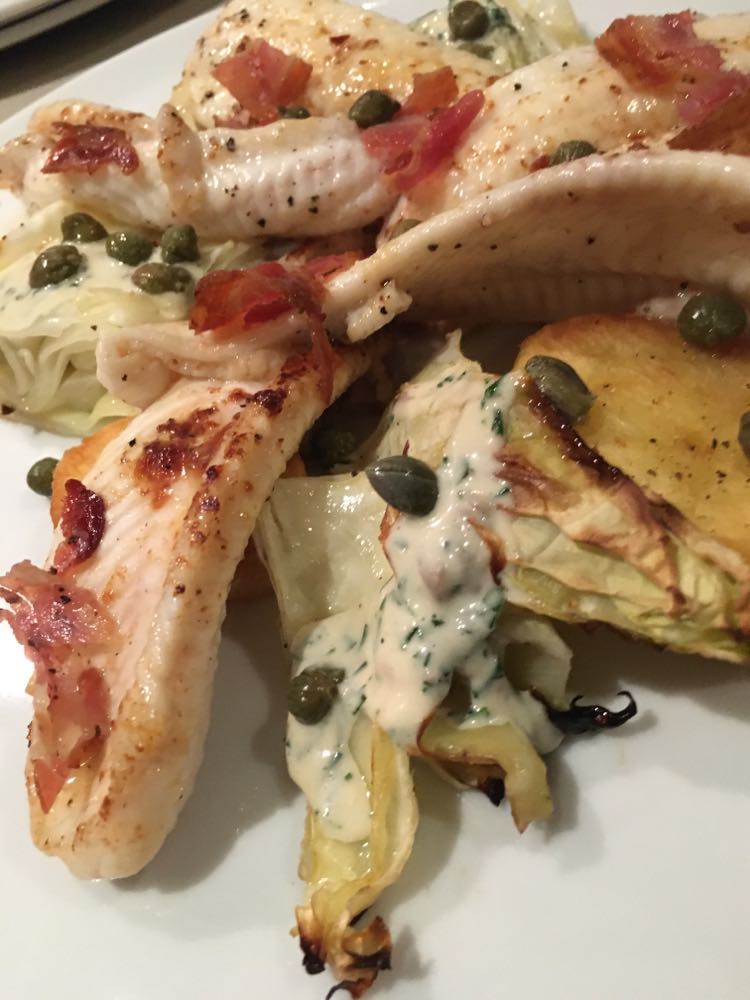 FILETS DE SOLE, CHOU POINTU GRILLE, LARD, CAPRES ET DRESSING A L’ANCHOIS