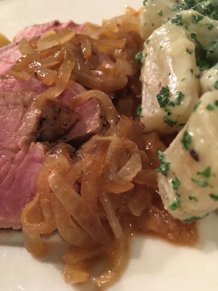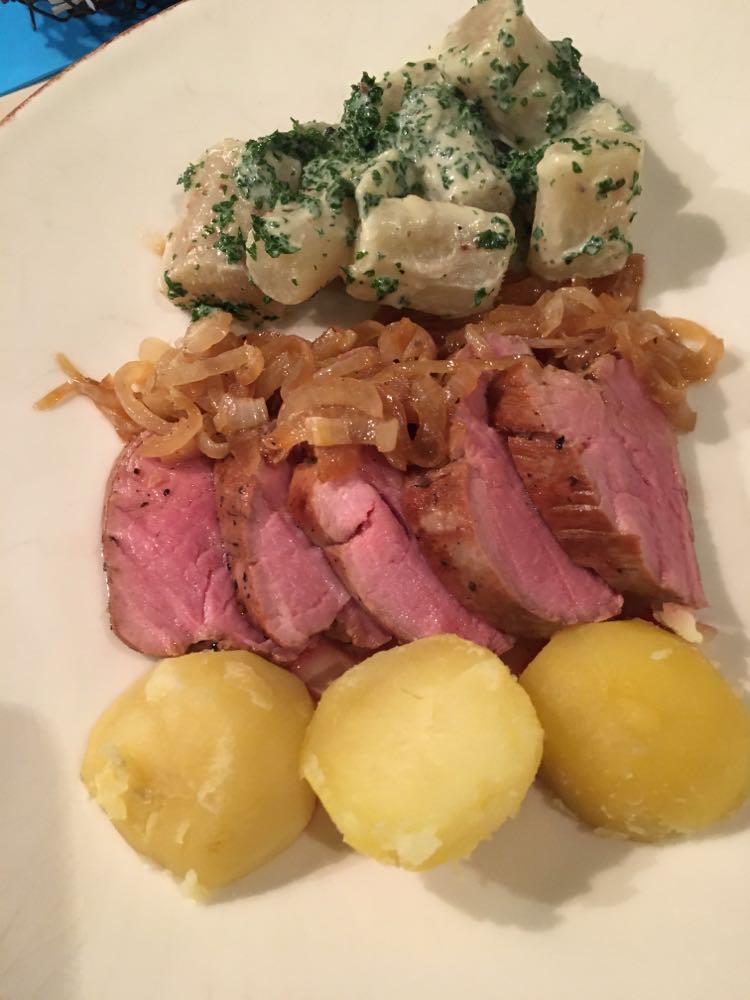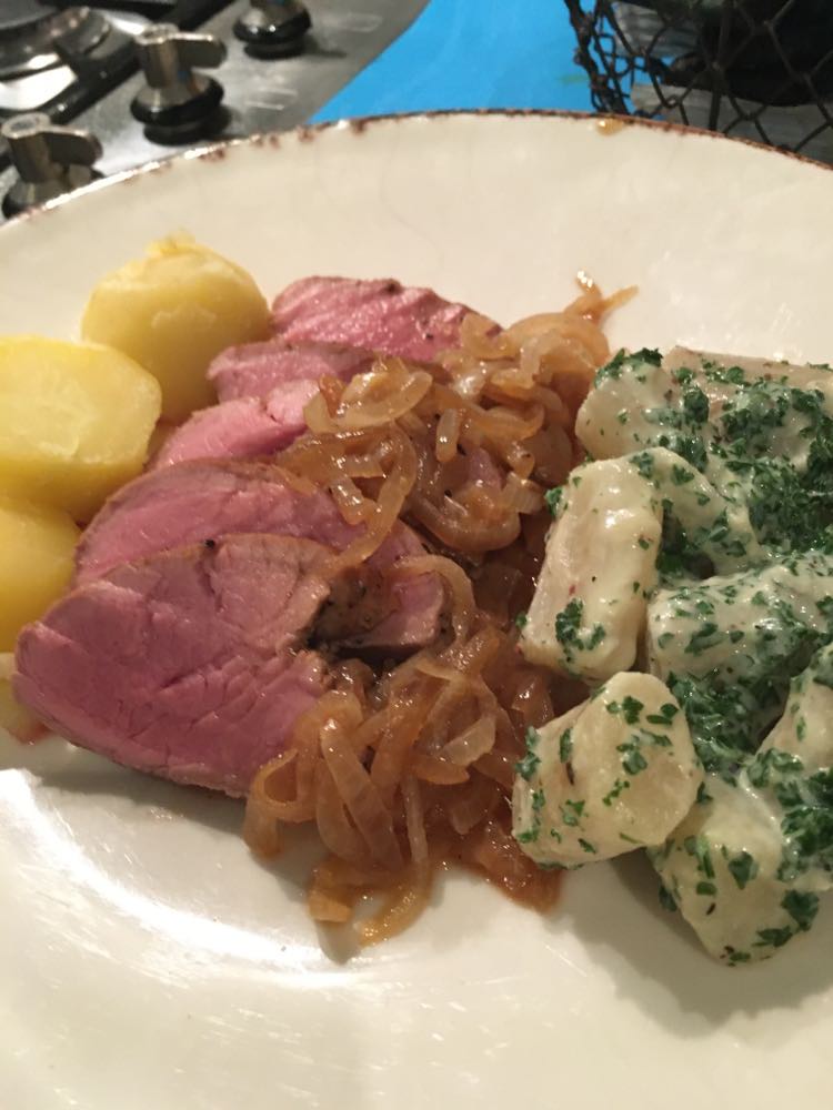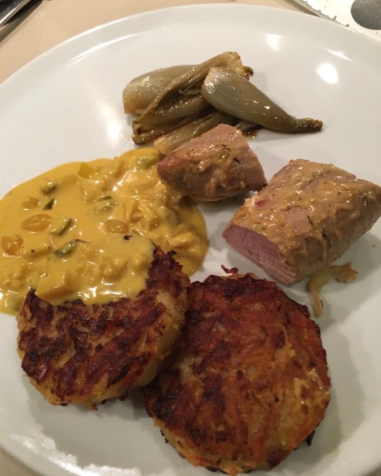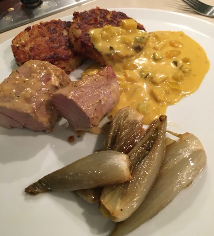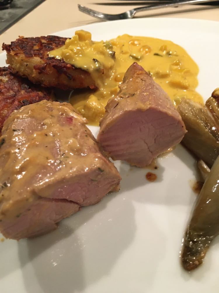Un plat simple mais tellement bon si vous respectez toutes les cuissons. Certains trouveront la cuisson du filet pur de porc trop rouge, mais le temps ou il fallait faire attention en cuisant du porc, est un peu révolue. En choisissant une viande de porc de qualité, en l’achetant chez un bon boucher irréprochable sanitairement, en surgelant immédiatement votre achat sous vide et en ne laissant pas trainer votre viande pendant des heures avant de la cuire, une température de 58°C à coeur pour une viande moelleuse et juteuse, n’est plus du tout une hérésie. Pourquoi la viande de porc n’aurait elle pas doit aux mêmes égards que celle de boeuf, de veau ou de canard ?