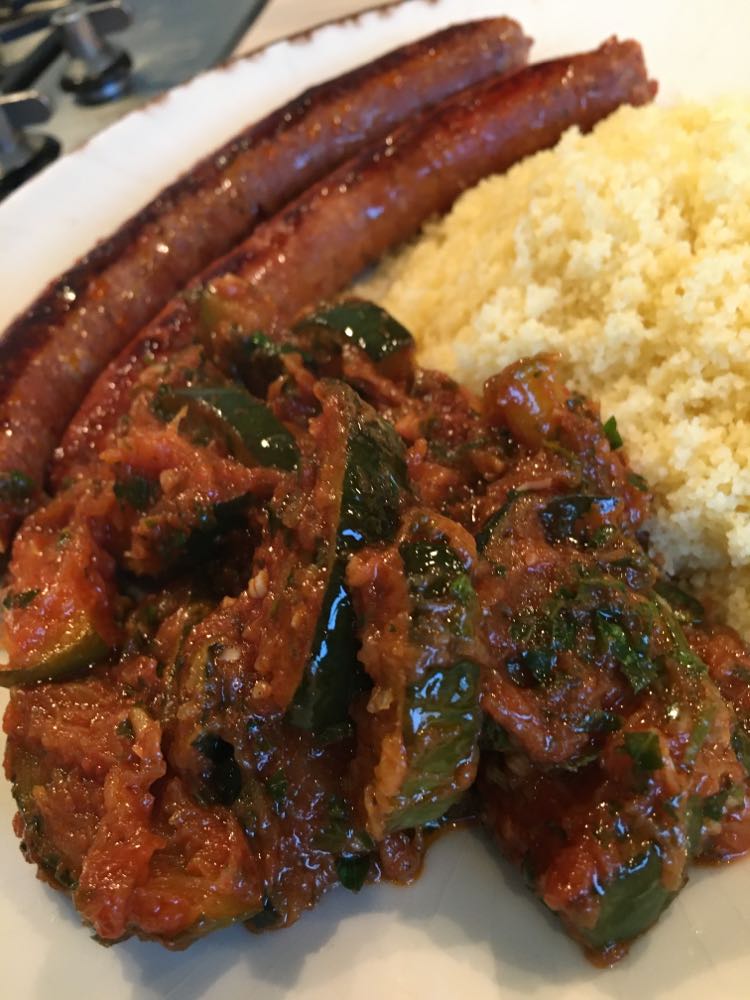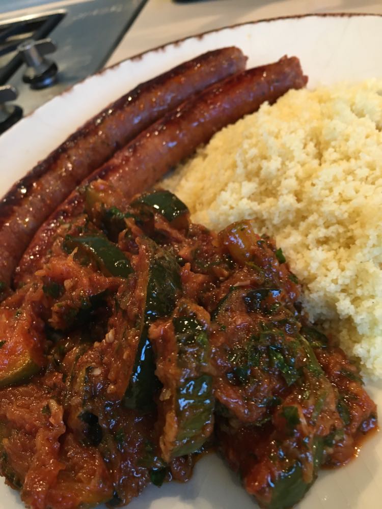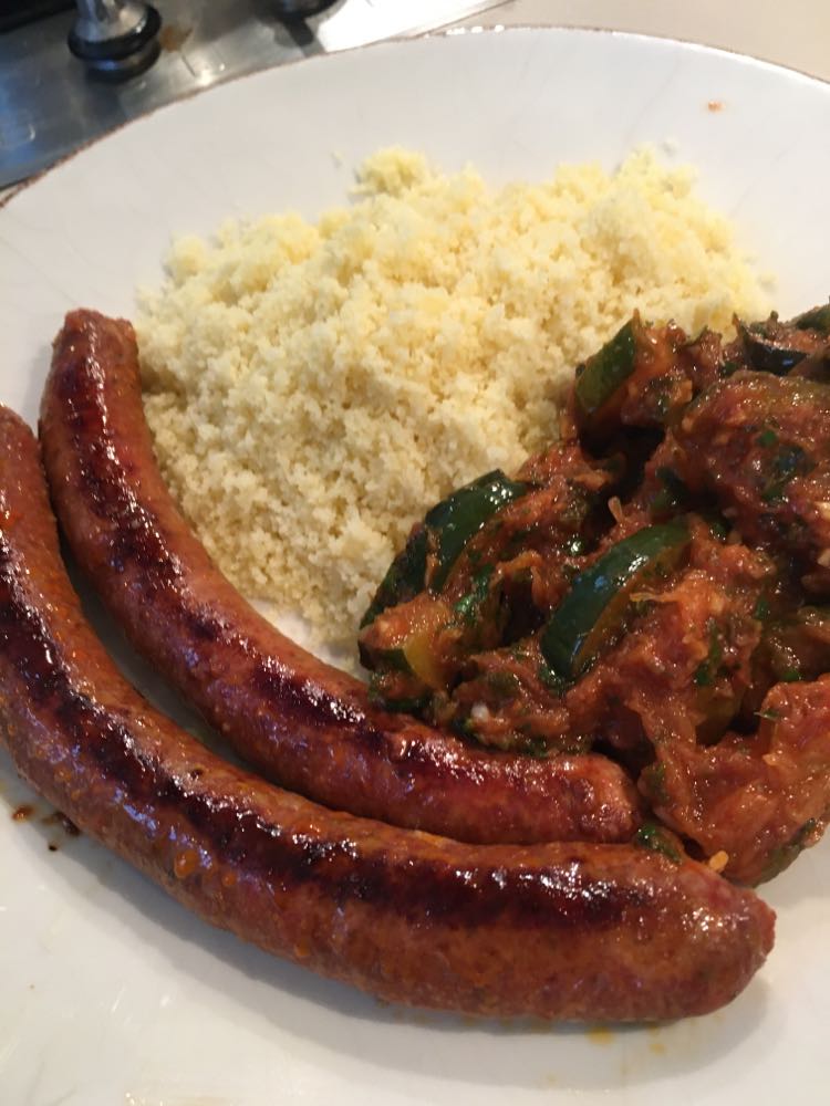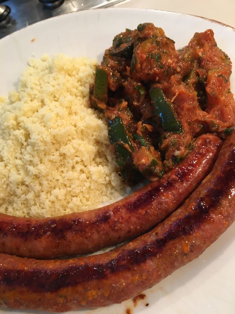 La recette est simple et rapide. Je l’ai complétée avec des merguez d’agneau et de la simple semoule nature.