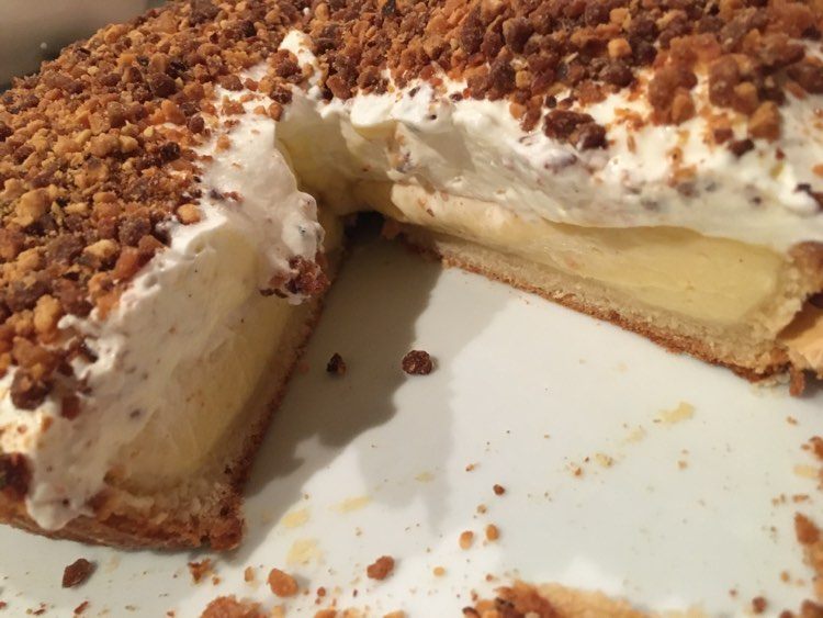 Bon je recherche ailleurs sur le net. C’est le vide intersidéral. J’y trouve les info’s de base sur quelques blogs et cites de revues culinaires : une tarte sur un fond de pâte levée avec une couche généreuse de crème pâtissière/flan pâtissier, recouverte d’une chantilly et parsemé de brésilienne (noisettes et amandes torréfiées caramélisées et mixées). Mais je ne trouves rien sur son origine, sur qui en est le créateur ni de quelle époque date sa conception. Pas mal de réactions pointent vers les Ardennes. Mais je n’en suis pas certain.
