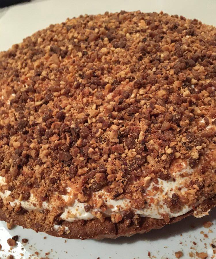 Fouetter la crème entière jusqu’à consistance ferme en y incorporant progressivement le sucre glace. La répartir sur la tarte de façon à former un dôme, puis saupoudrer généreusement de brésilienne.