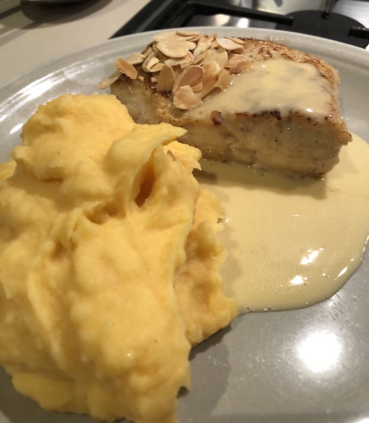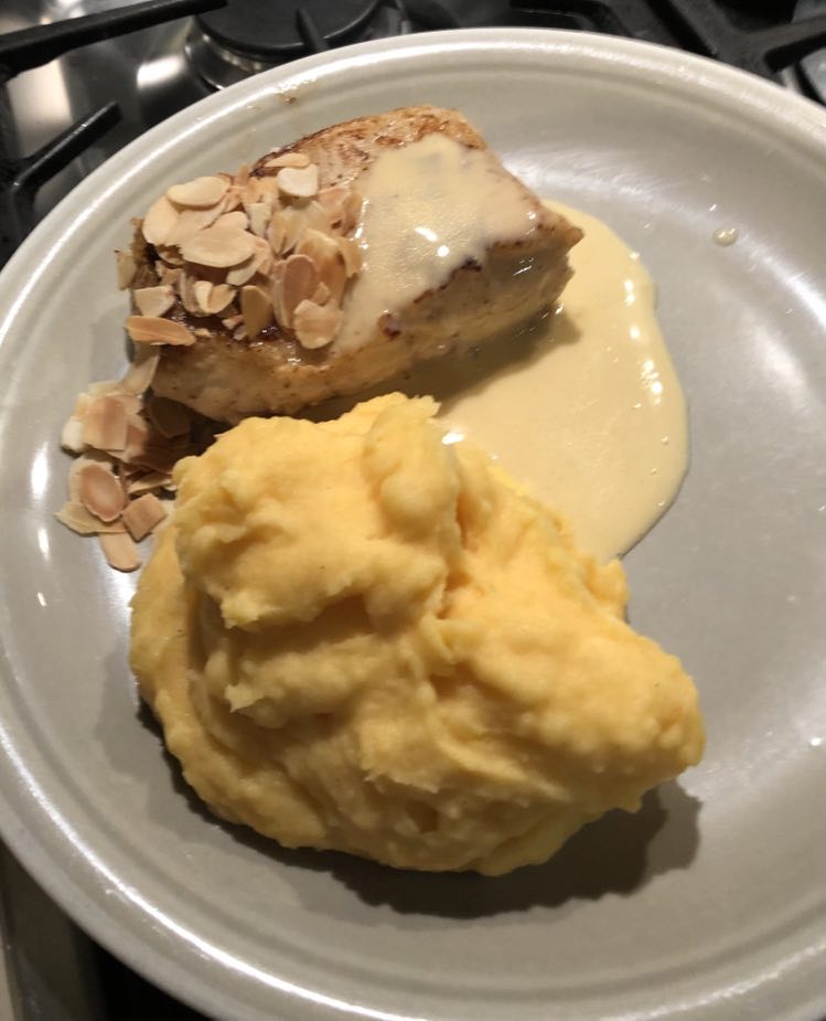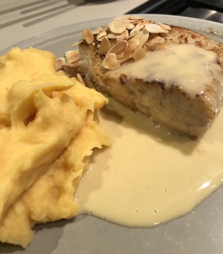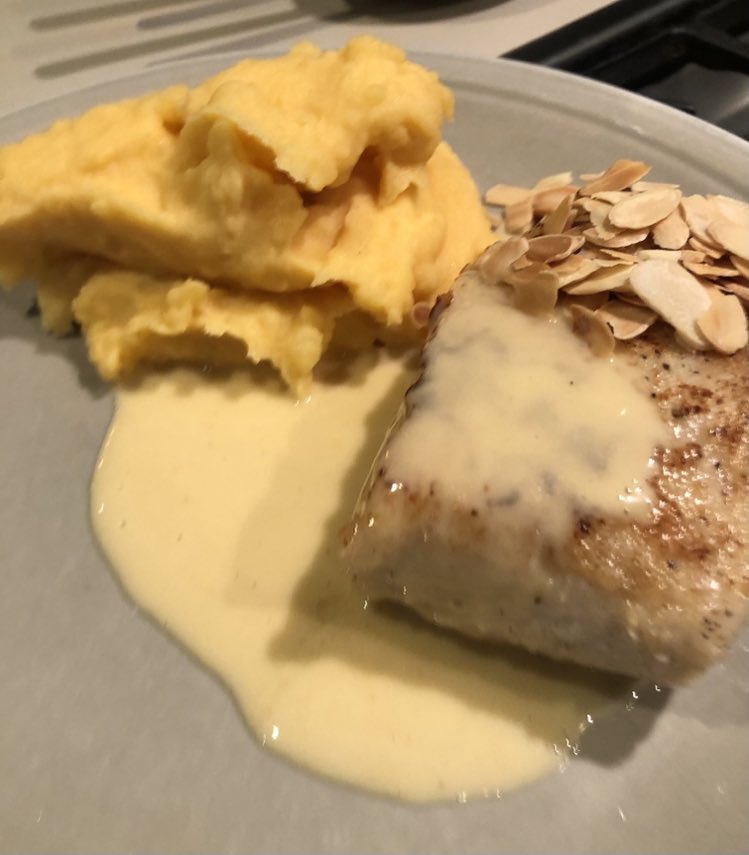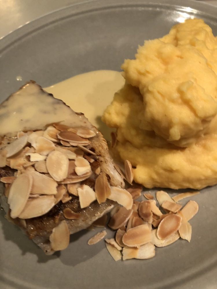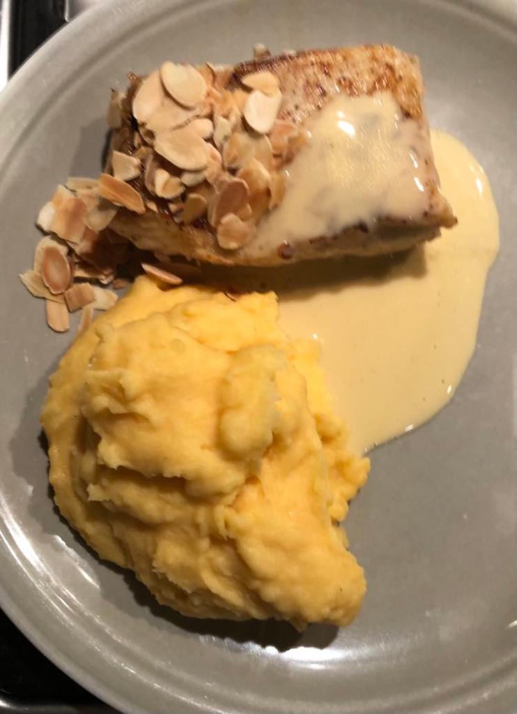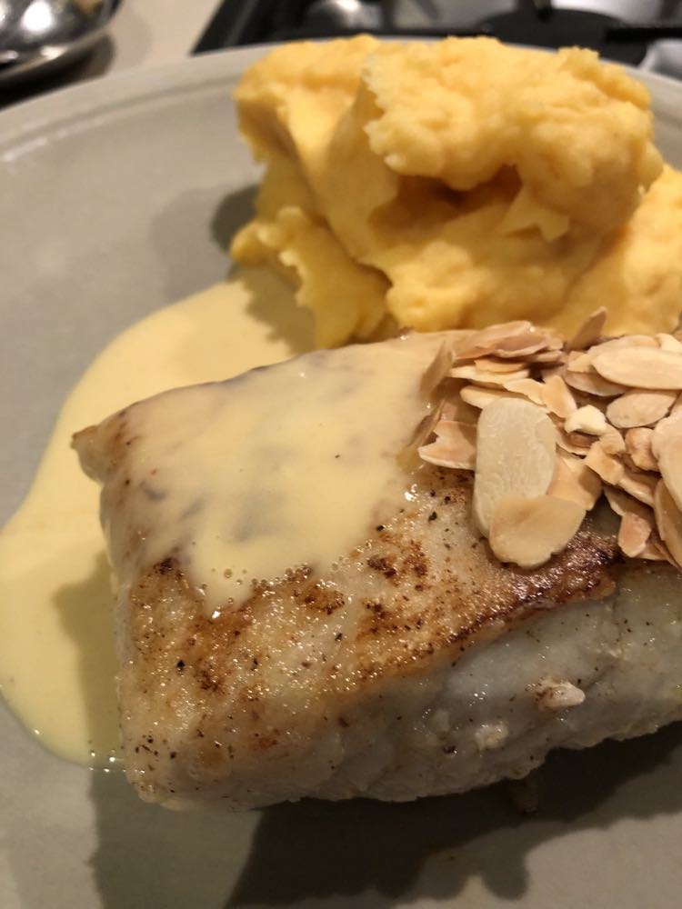DOS DE LIEU NOIR, PUREE DE POMMES DE TERRE A LA PATATE DOUCE ET BEURRE BLANC AU NOILLY PRAT, AMANDES EFFILEES