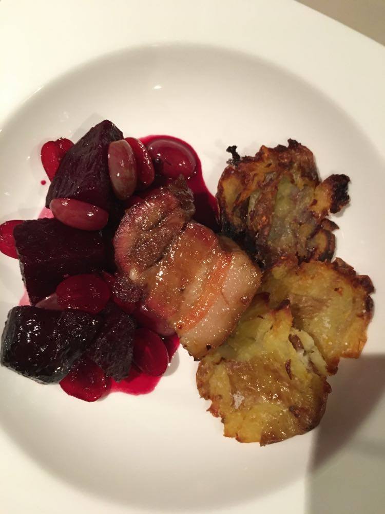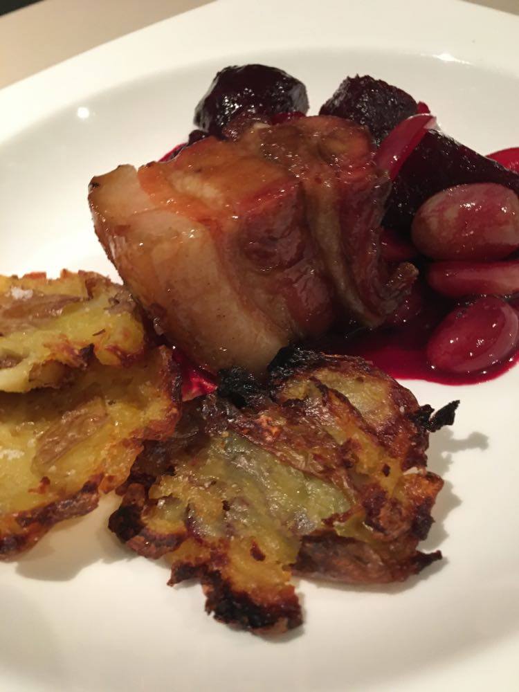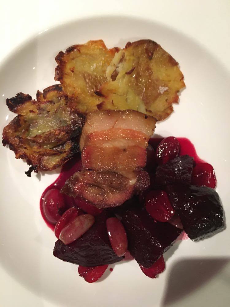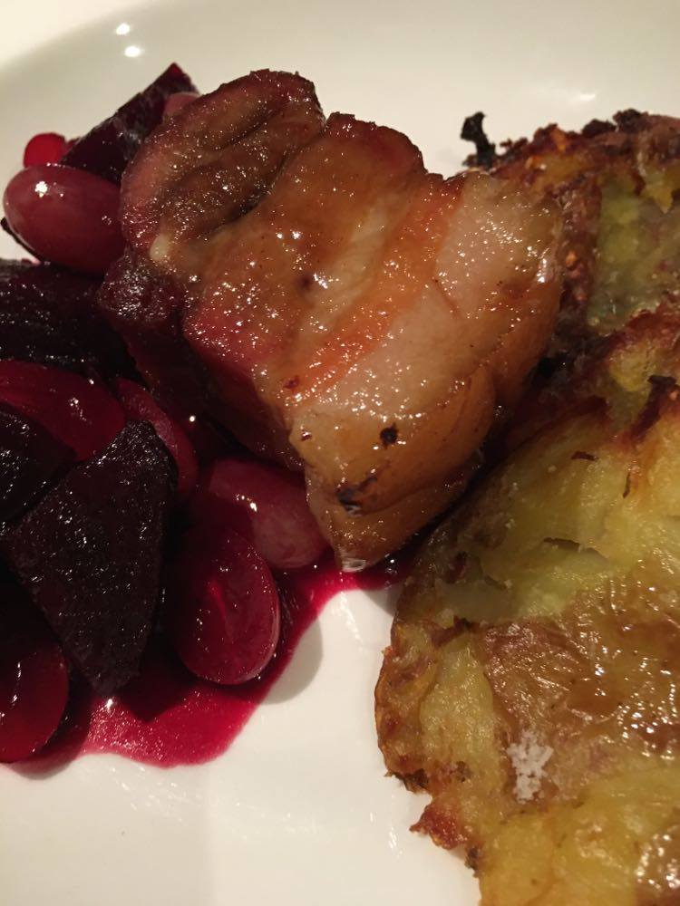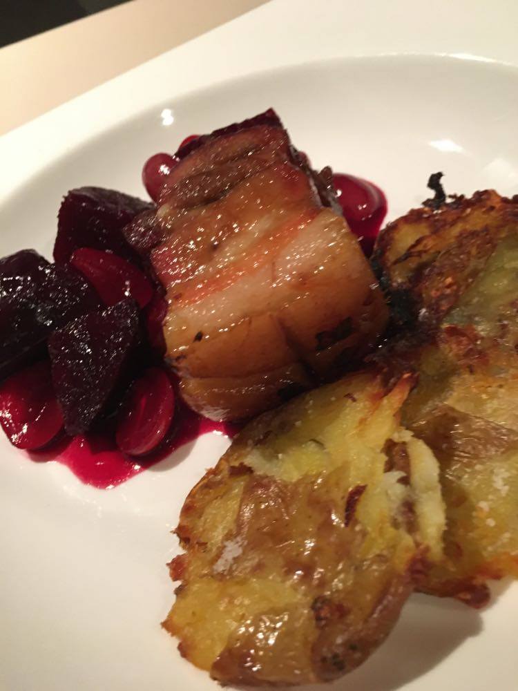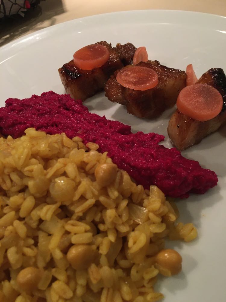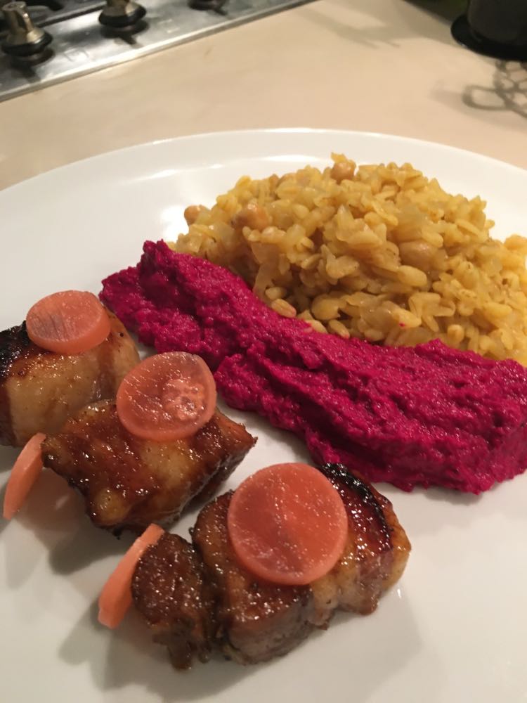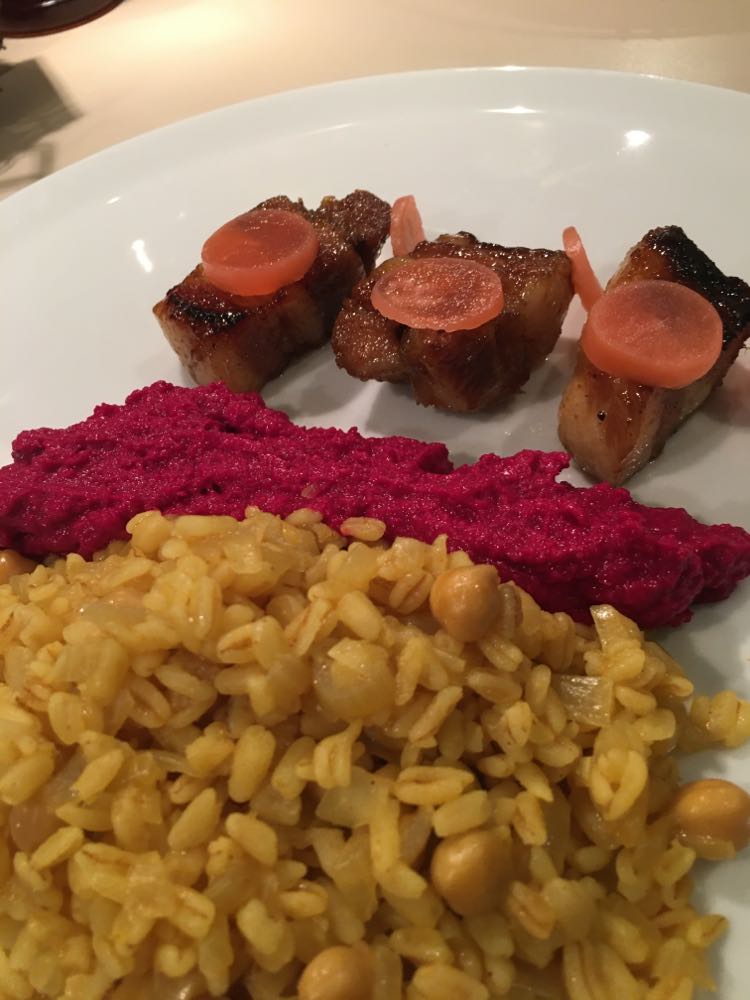 POITRINE DE PORC CONFITE, HOUMOUS DE BETTERAVES, BLE A LA MAROCAINE ET PICKLES DE RADIS