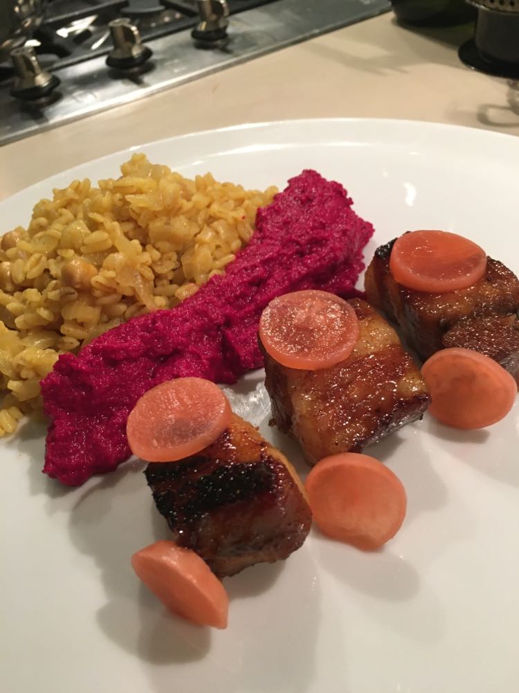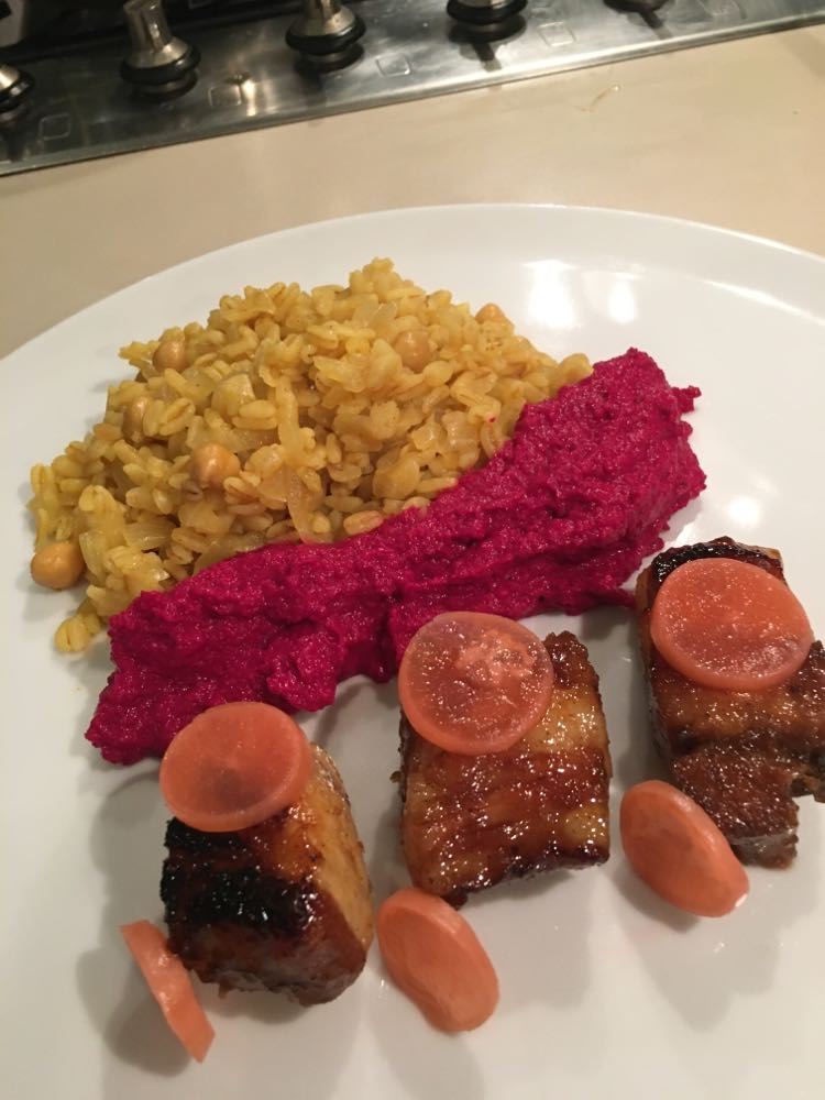 J’avais envie de refaire ma recette de base de lard de poitrine de porc confite longuement et terminé en laquage. Pour l’accompagner comme la dernière fois, de la betterave, mais cette fois sous une forme plutot oriëntale, car associé aux pois chiches et au sésame, en houmous. En plus d’être bon, la couleur est magnifique.