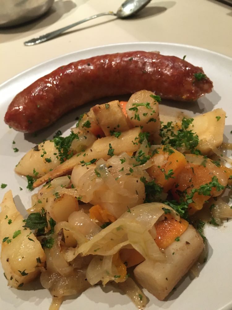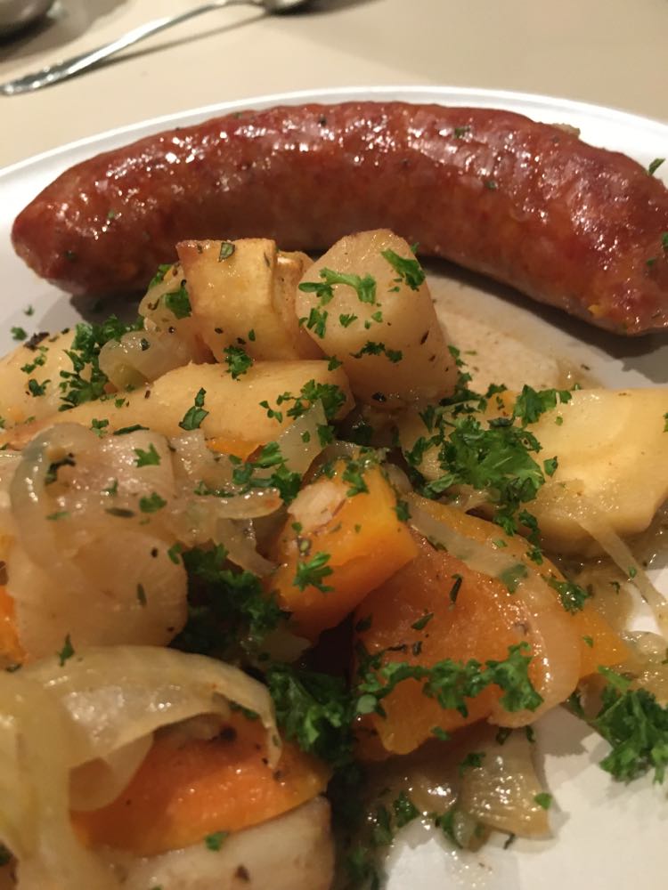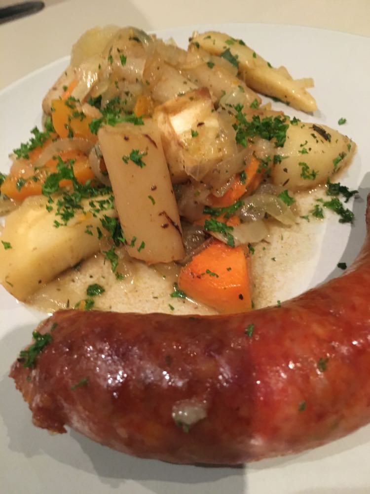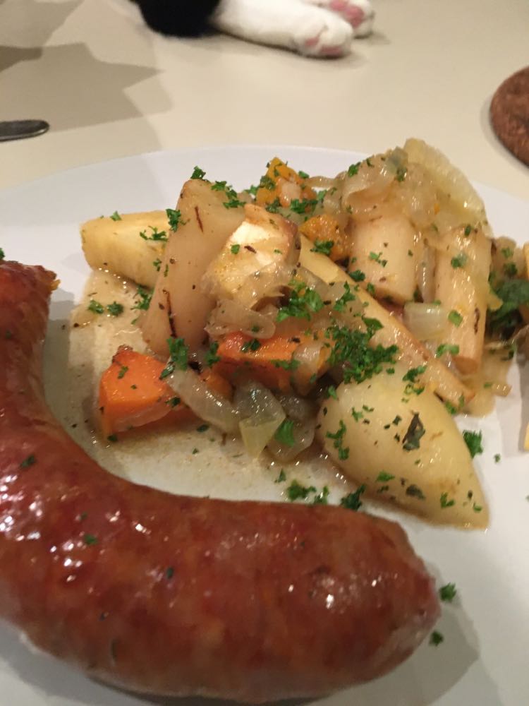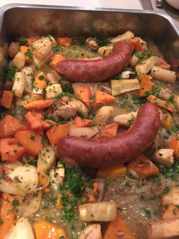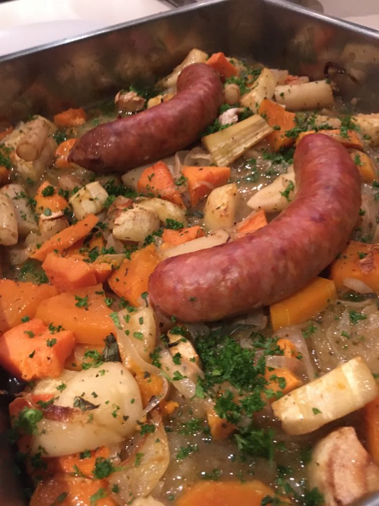 J’avais plein de légumes racines dans mon frigo et deux saucisses au chorizo du Wesley’s Butcher Shop à Schaerbeek. J’ai imaginé la recette suivante pour faire le plein de légumes. Avec un ratio 1 kg 500 de légumes (avant cuisson) pour 2 saucisses, je pense qu’on était dans le bon.