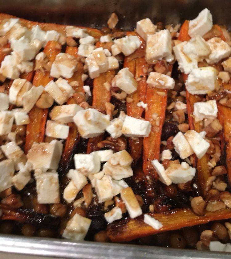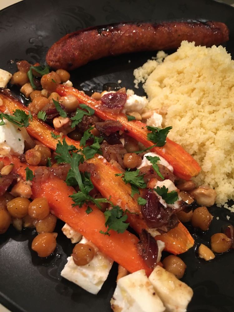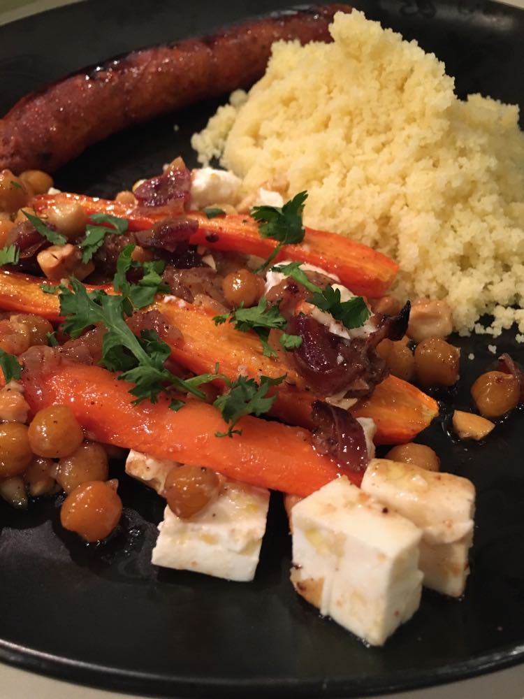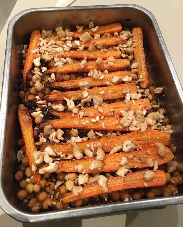 Sortir le plat du four. Les pois chiches seront entre le confit et le croustillant, les carottes cuites et un peu croustillantes.