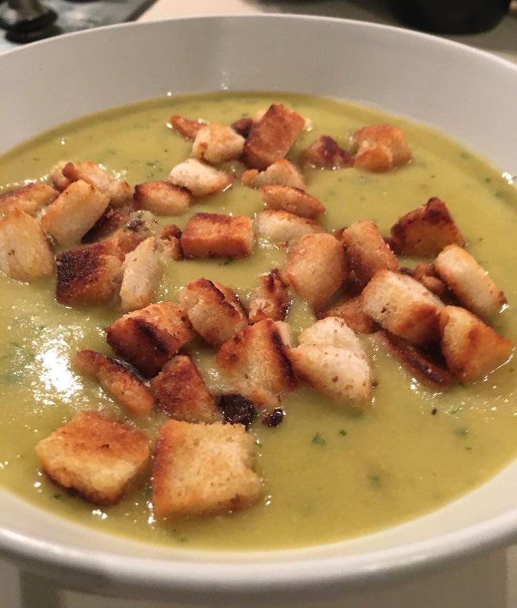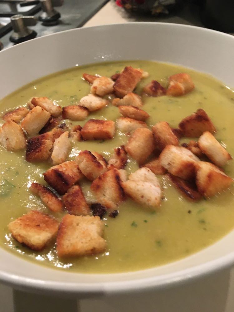 J’ai eu un rappel à ce type de soupe grâce à ma copine Ana (blog Leauàlabouche). J’ai pris une de mes bases et fait avec ce que j’avais dans mon frigo. J’ai par contre repris la bonne idée d’Ana des petits morceaux de baguette avec Gruyère gratiné et du Gruyère dans le potage, même si j’ai un peu trop poussé la précuisson des tranches de baguette.