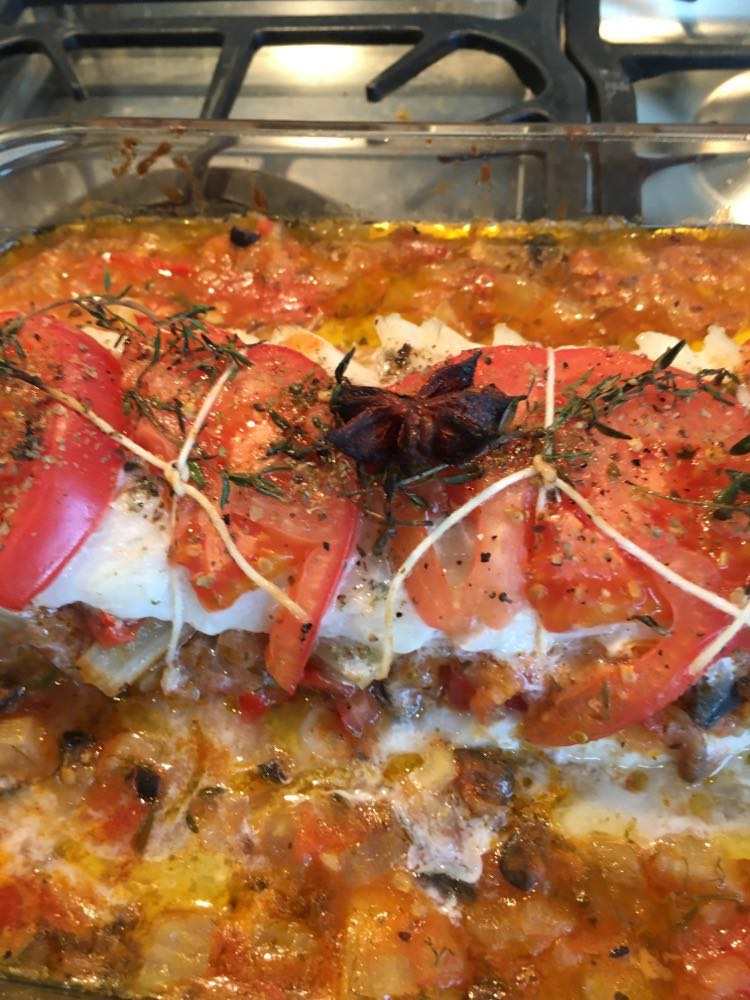 Sortir la cocotte du four. Goûter et rectifier en sel, poivre et sucre et selon votre goût en origan. Si la sauce vous parait encore trop liquide, prolonger encore la cuisson sur une taque. En fin de cuisson ajouter encore 10 cl de bouillon de boeuf.