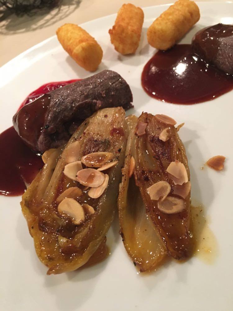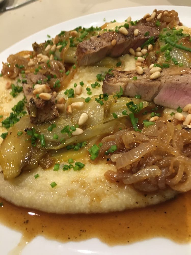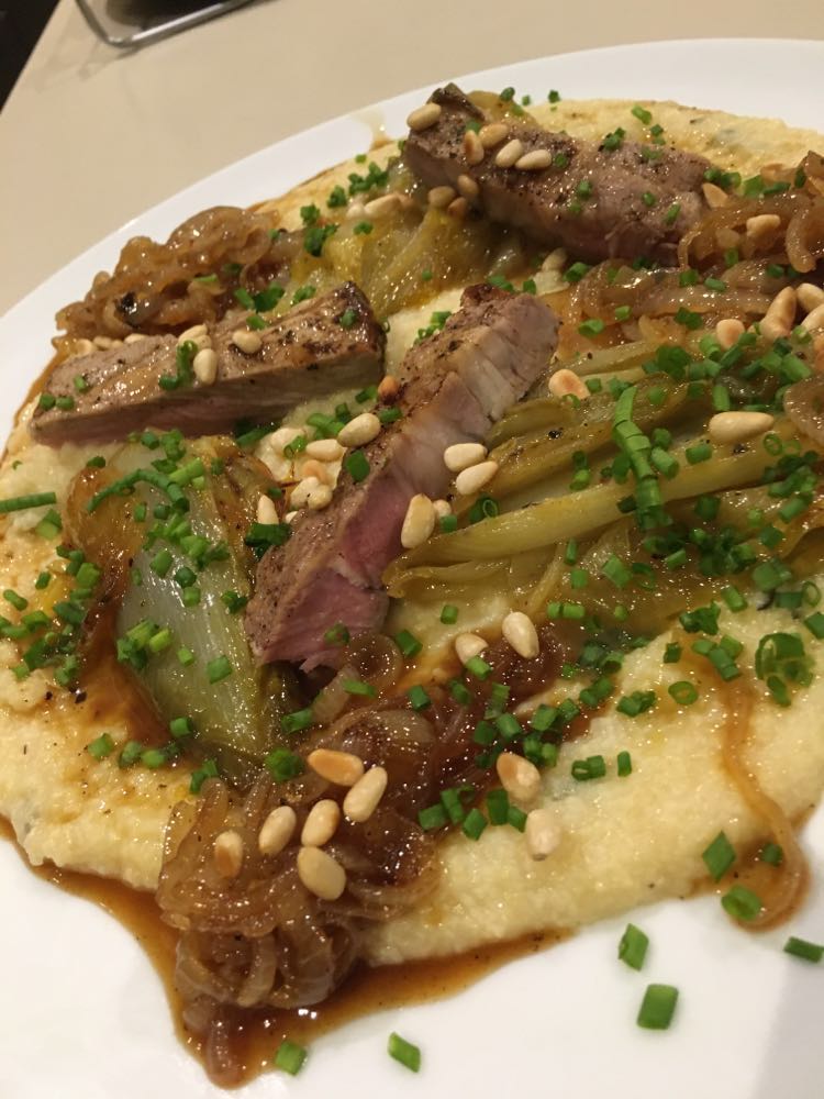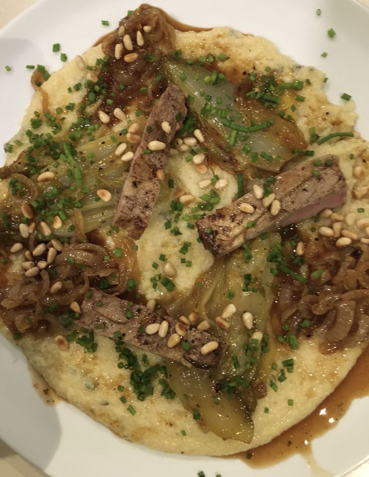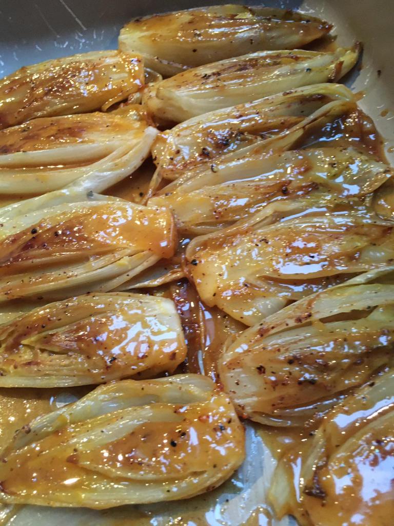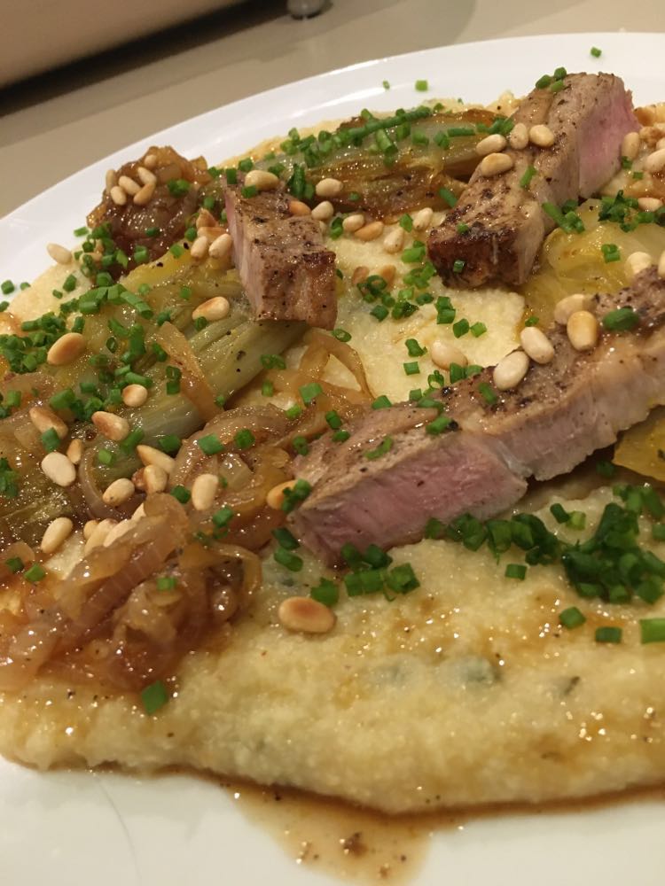 CHICONS BRAISES AU MIEL ET A L’ORANGE, SPIRINGUE AUX OIGNONS AIGRE-DOUX, POLENTA CREMEUSE, PIGNONS ET CIBOULETTE