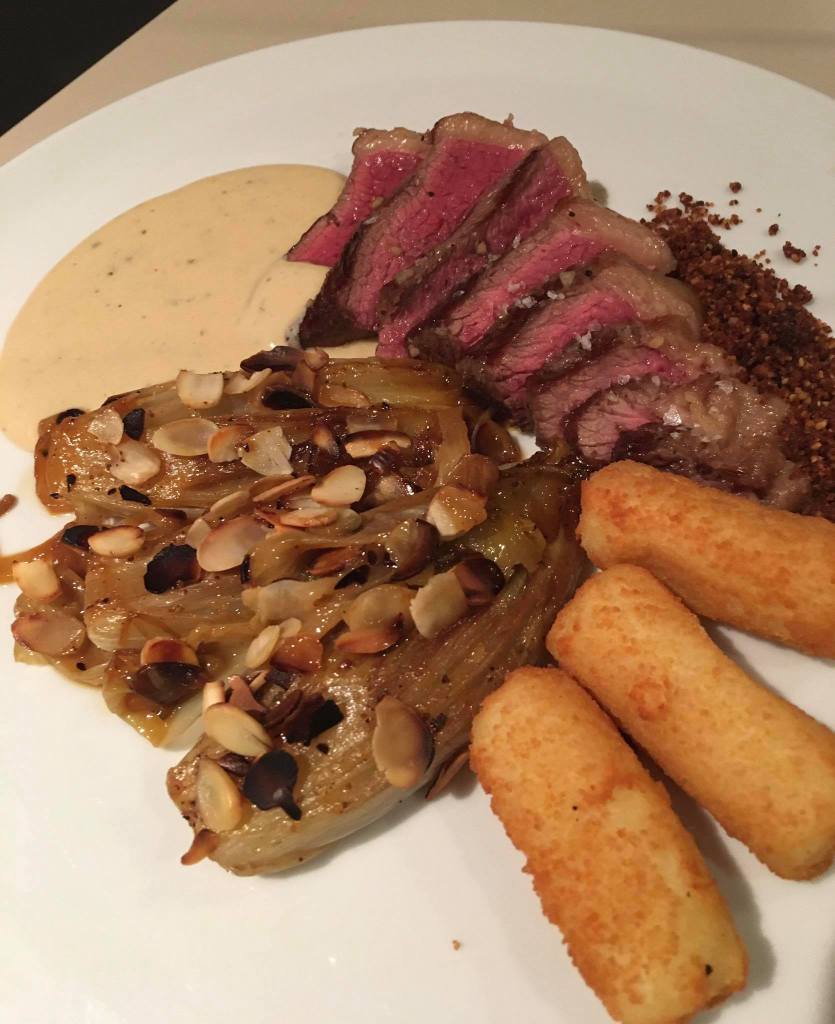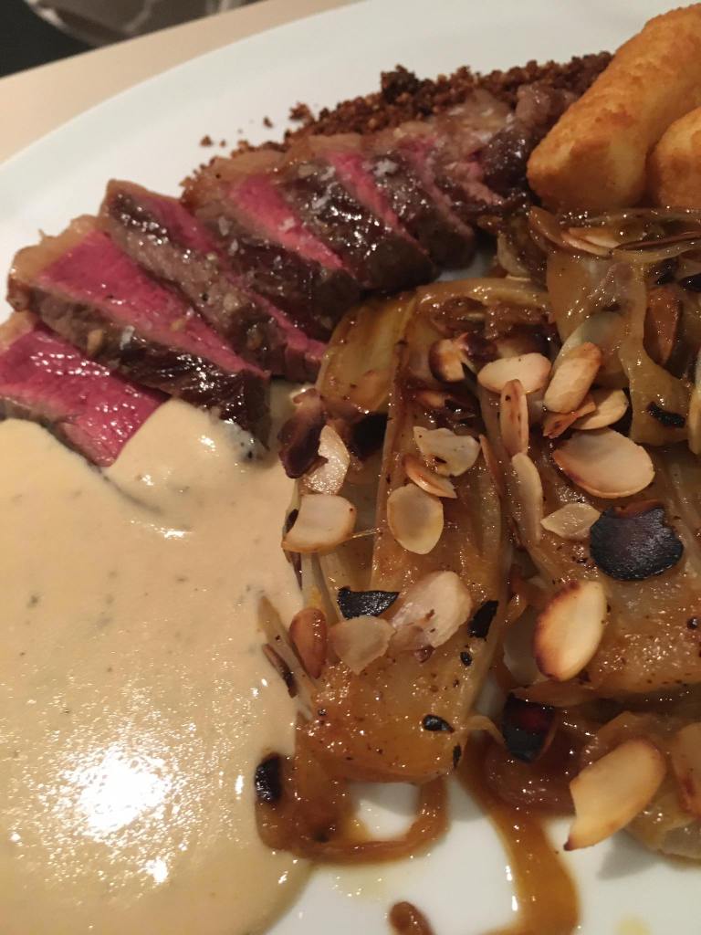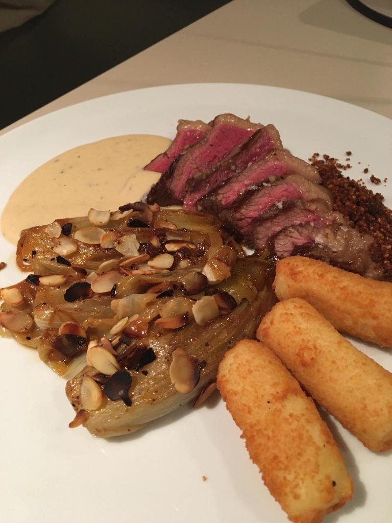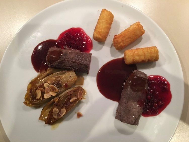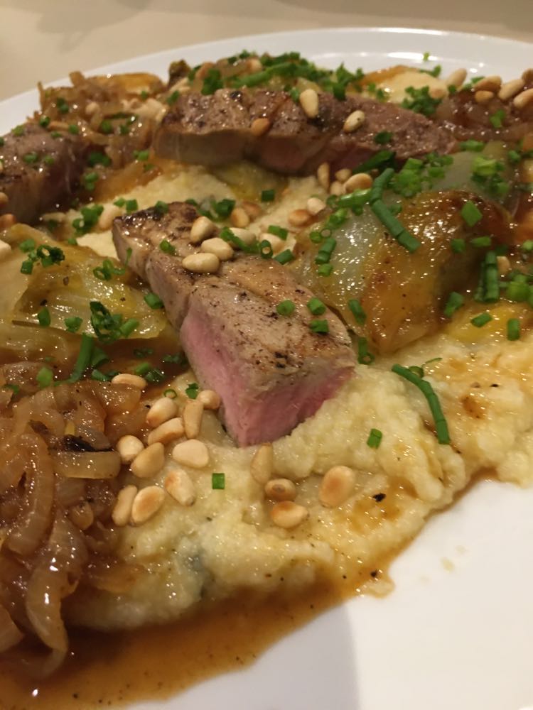 CHICONS BRAISES AU MIEL ET A L’ORANGE, SPIRINGUE AUX OIGNONS AIGRE-DOUX, POLENTA CREMEUSE, PIGNONS ET CIBOULETTE