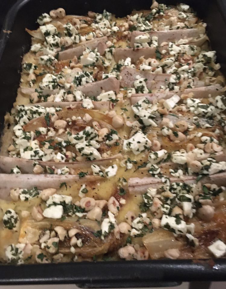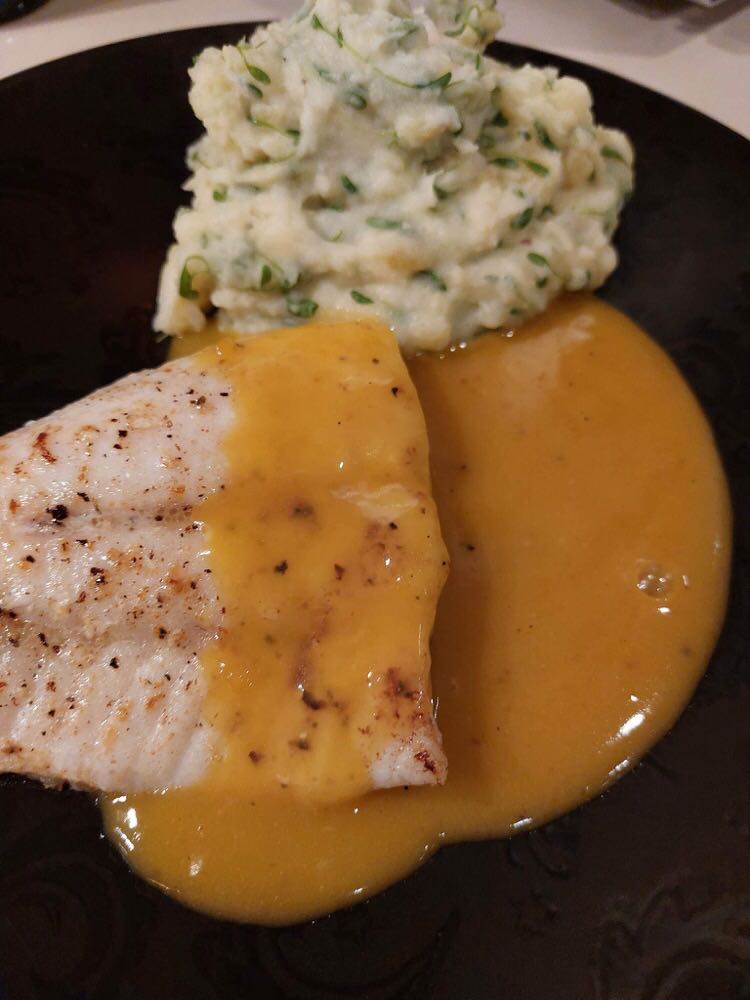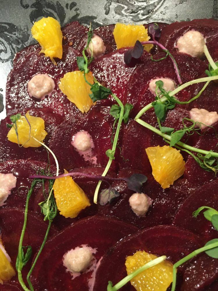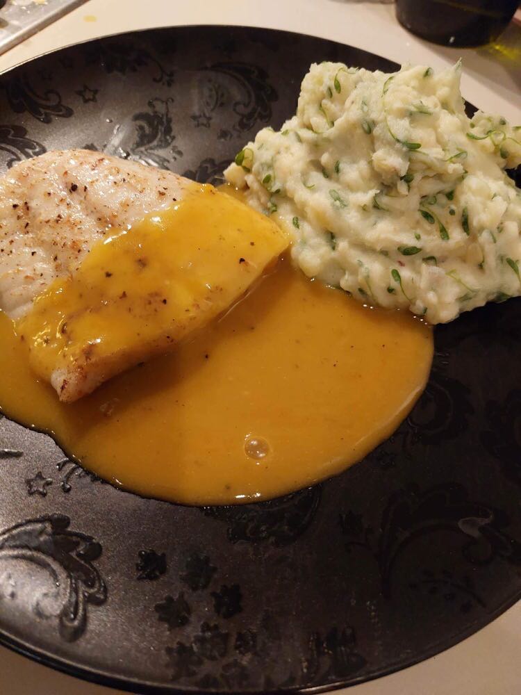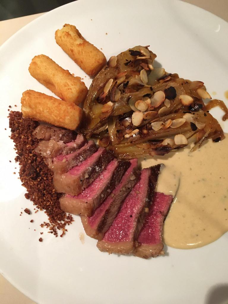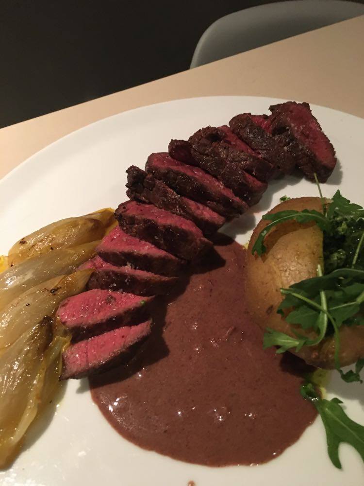 CHICONS BRAISES AU MIEL ET A L’ORANGE, SPIRINGUE AUX OIGNONS AIGRE-DOUX, POLENTA CREMEUSE, PIGNONS ET CIBOULETTE