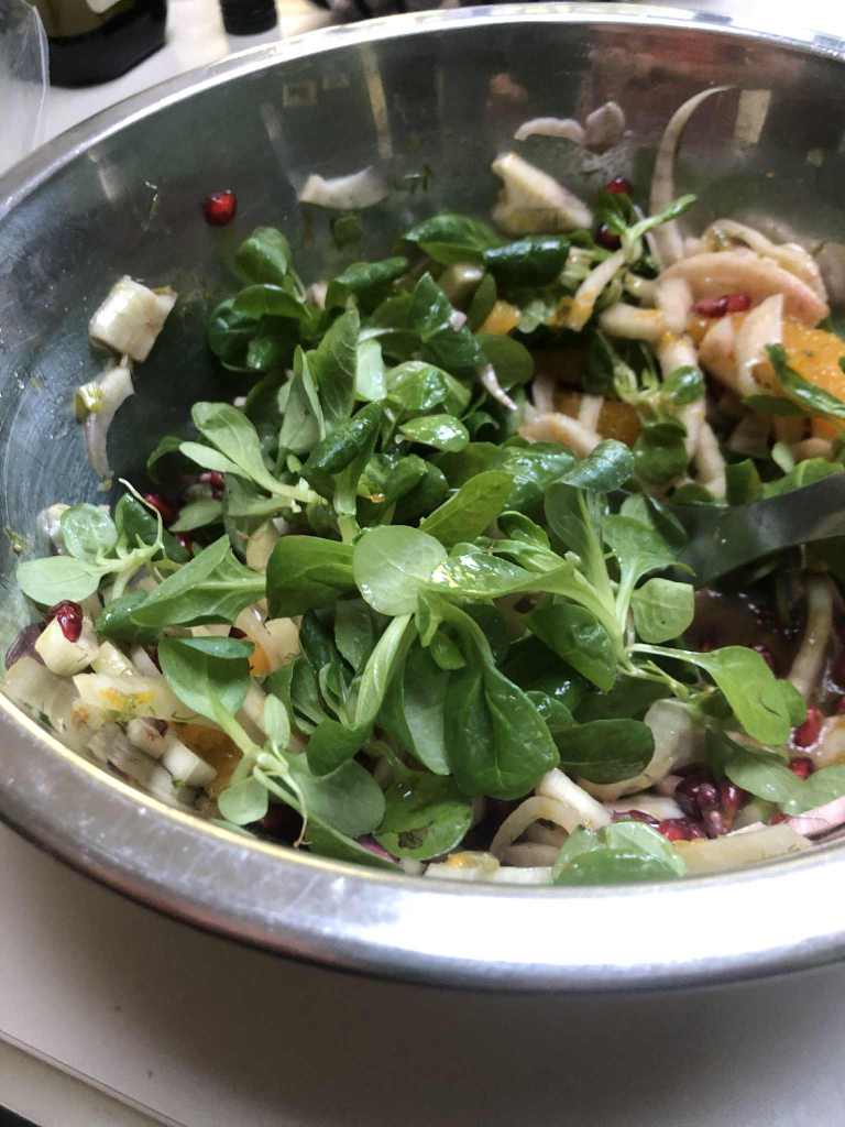 Mélanger avec un fouet, l’huile d’olive, le jus et le zeste d’orange, la chair des fruits de la passion, 2 c à s de graines de grenade, le miel et le vinaigre. Saler et poivrer.