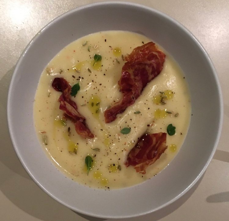 Une recette trouvée sur les réseaux et que j’ai adaptée uniquement au niveau de certaines quantités et au niveau des bouillons. Il s’agit à la base d’une recette végane car la crème liquide y est remplacée par les pignons, qui vont épaissir la soupe une fois cuits et mixés. Dans la recette de base on parle de ‘stock’, donc bouillon t je suppose qu’il s’agit de bouillon de légumes. Comme je ne suis ni végan ni végétarien, j’ai utilisé 40 cl de bouillon de volaille et 35cl de bouillon de légumes (j’aime bien le bouillon de volaille).