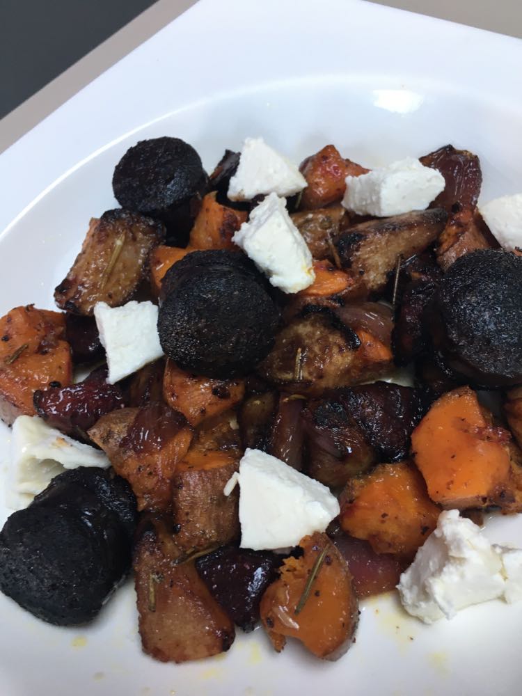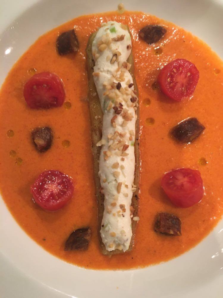Panais rôti farcis au fromage de chèvre frais et noisettes, gaspacho tomates-poivrons rouges, datterini et chorizo