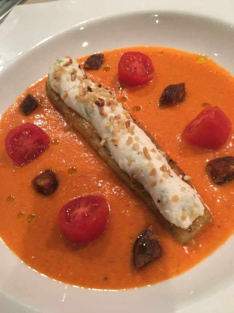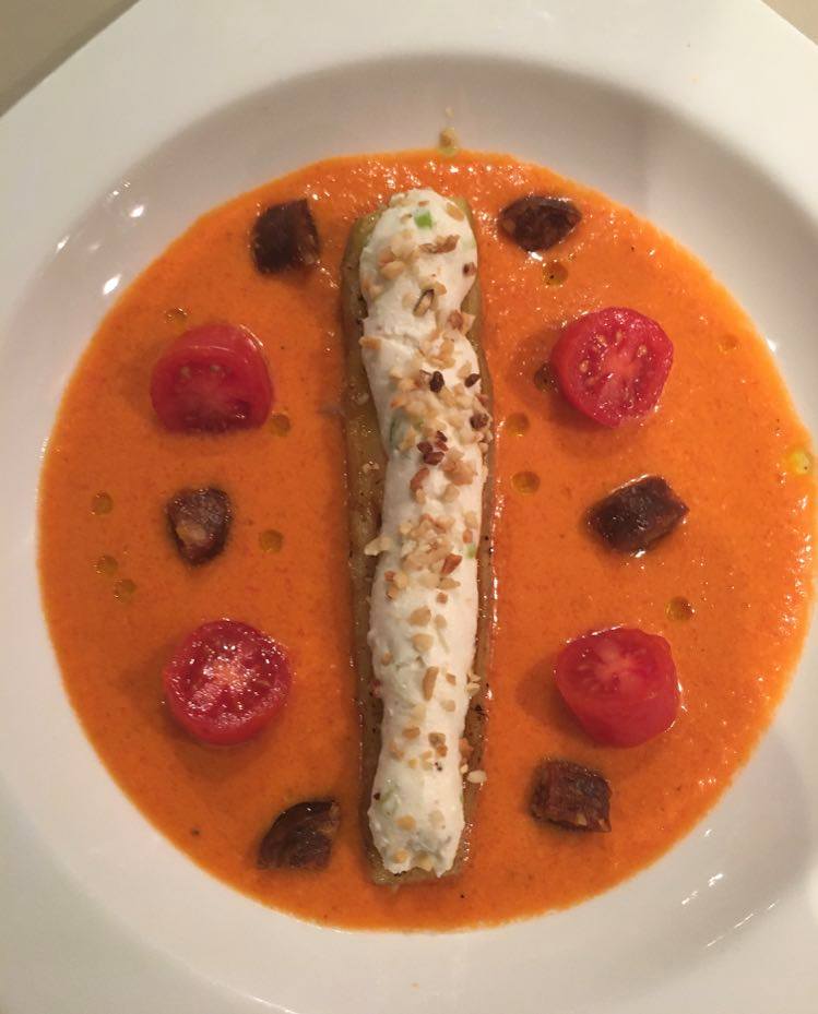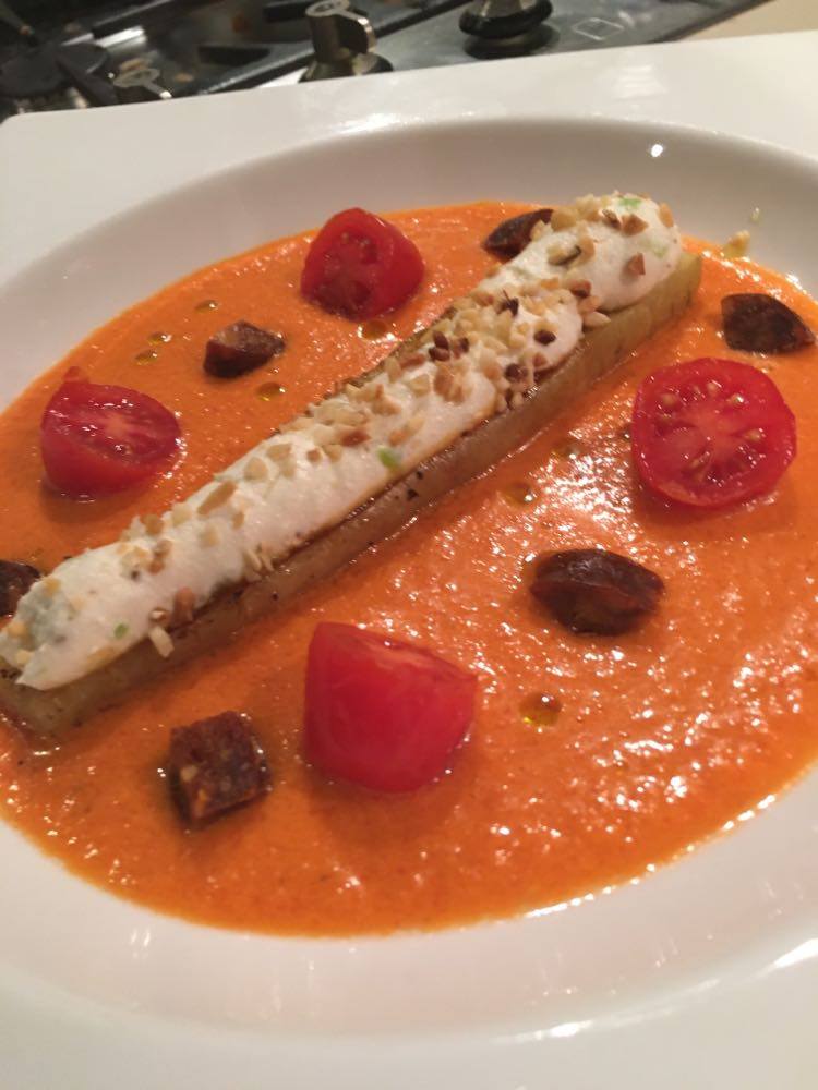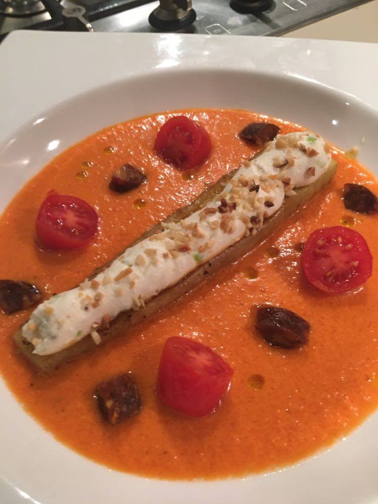 PANAIS ROTI FARCIS AU FROMAGE DE CHEVRE FRAIS ET NOISETTES, GASPACHO TOMATES-POIVRONS ROUGES, DATTERINI ET CHORIZO