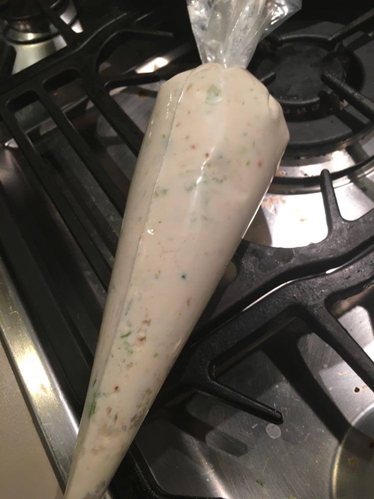 Ecraser le chèvre avec la crème épaisse. Ajouter un peu de sel, de poivre et de piment d’Espelette.