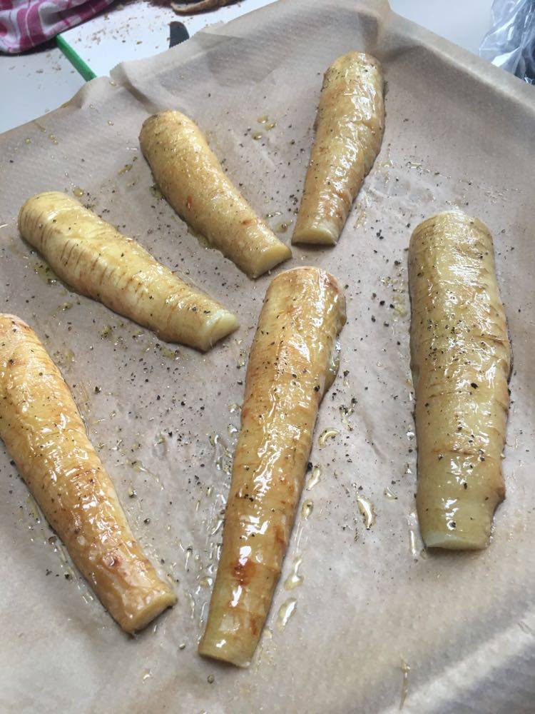 Enduire les demi panais d’huile d’olive avec une petite brosse et sur toutes les faces. Les saler et poivrer, également sur les deux faces.