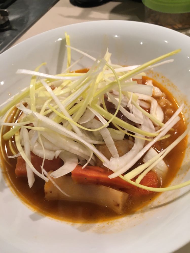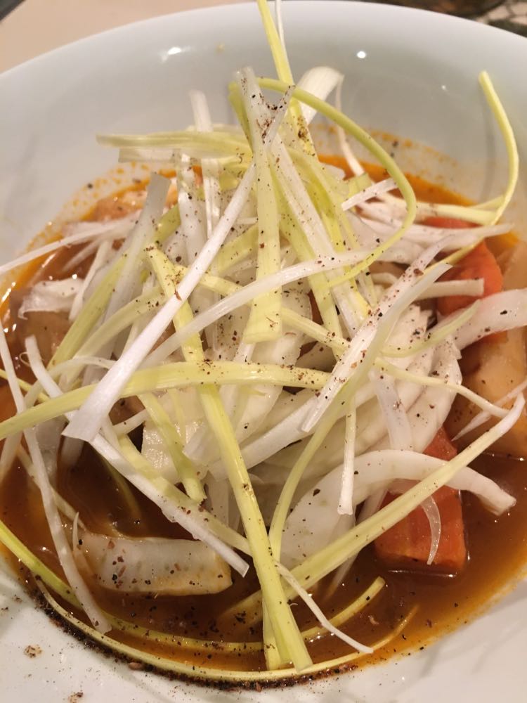 Verdict après dégustation : c’est très bon et très frais grâce aux herbes aromatiques, la sauce hoisin sur ce potage, c’est top. Mon bouillon manquait un peu de sauce poisson, nous avons du ajouter quelques gouttes dans nos assiettes. J’ai déjà adapté dans la recette, ainsi que deux ou trois autres détails. J’avais également oublié de sortir les jarrets après 2 h de cuisson, ils tombaient donc en miettes. Finalement, j’avais d’abord mis la viande, puis les nouilles, au lieu de faire l’inverse.