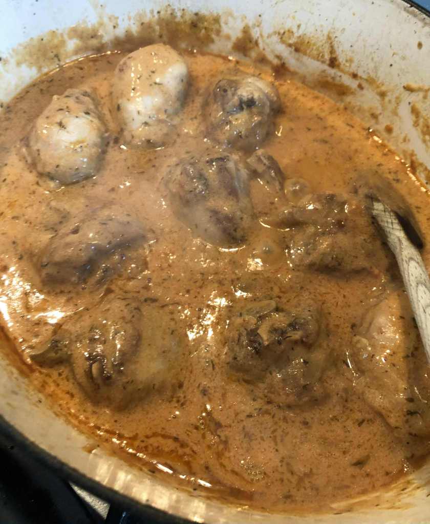 Réchauffer tout doucement les morceaux de poulet dans cette sauce.