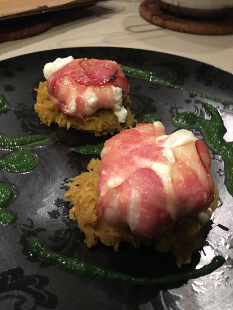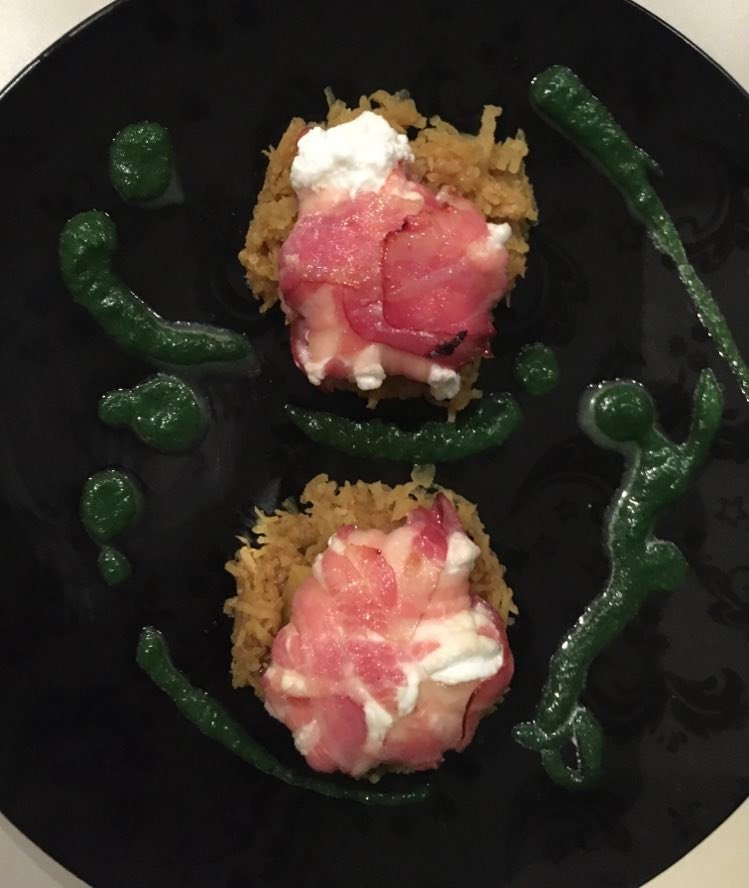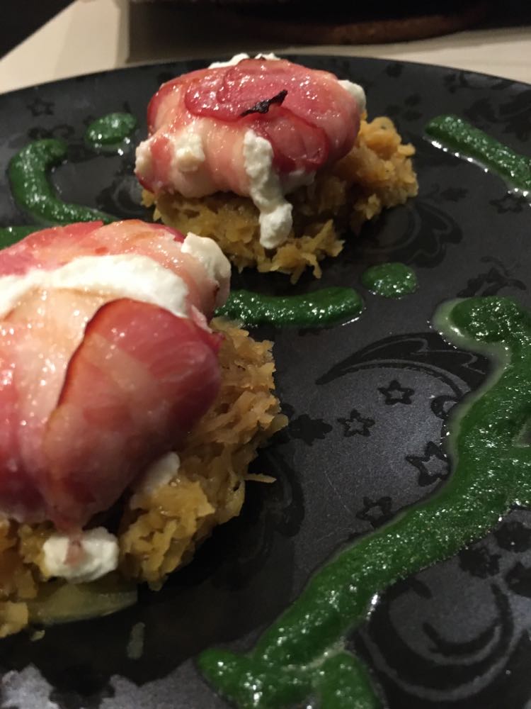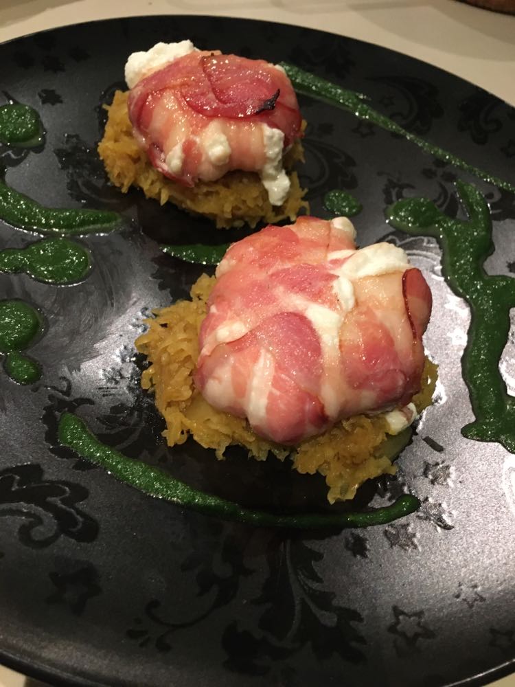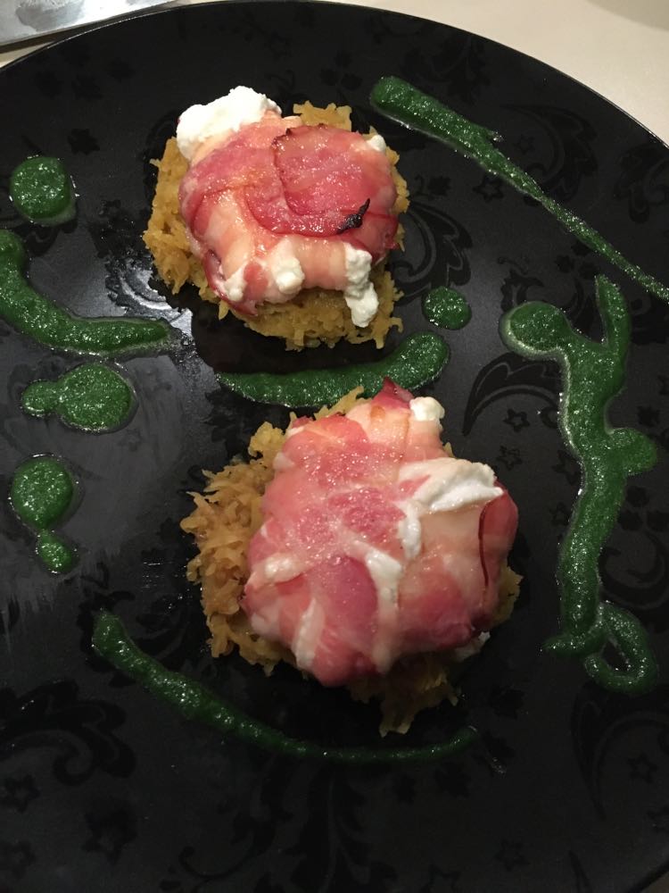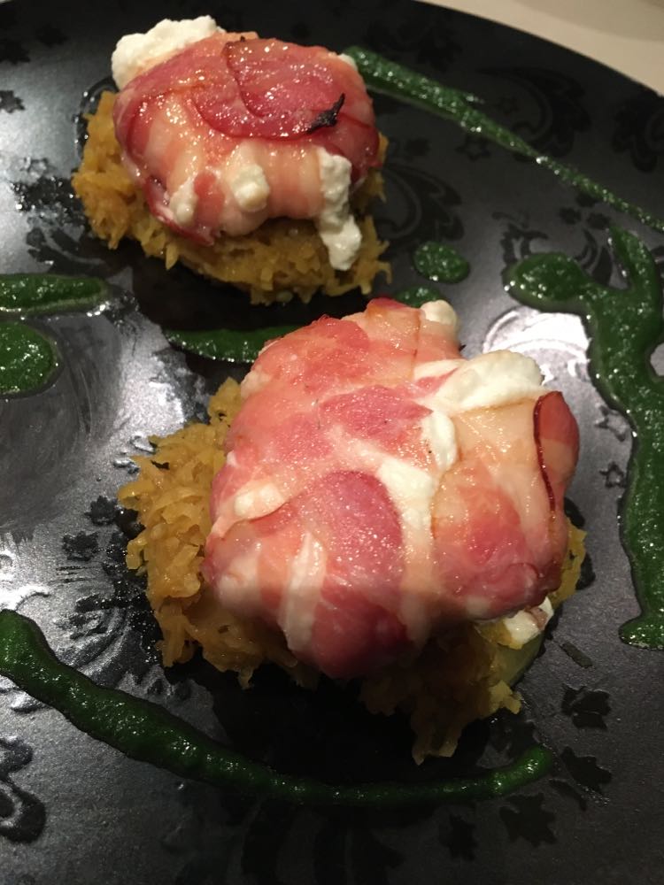 CHEVRES CHAUDS LARDES, RAPEE DE BETTERAVE JAUNE ET DE YACON CUITS A LA REDUCTION D’ORANGE SANGUINE, COULIS EPINARDS-CERFEUIL