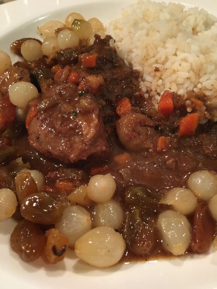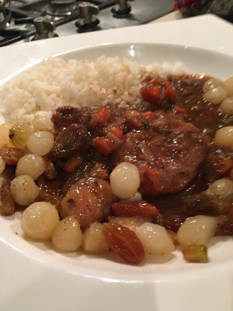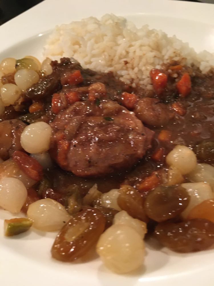 COCOTTE DE JOUES DE PORC AUX OIGNONS GRELOTS, RAISINS BLONDS ET MARRONS