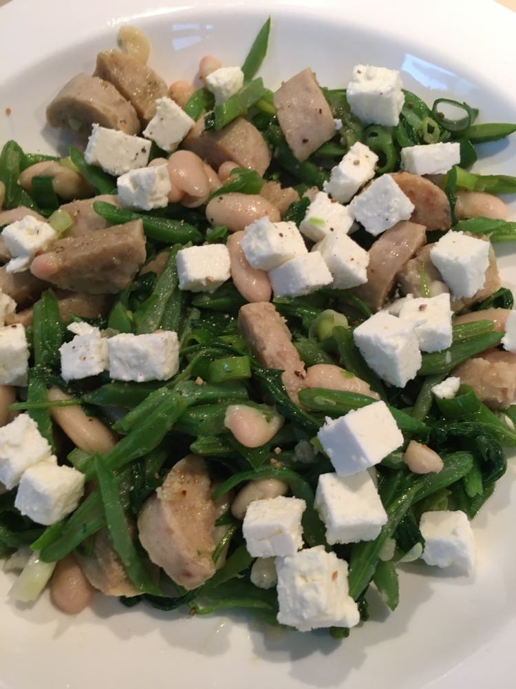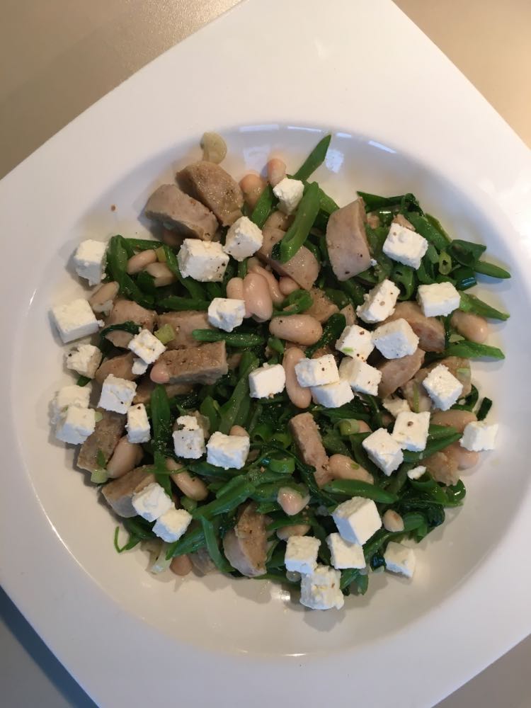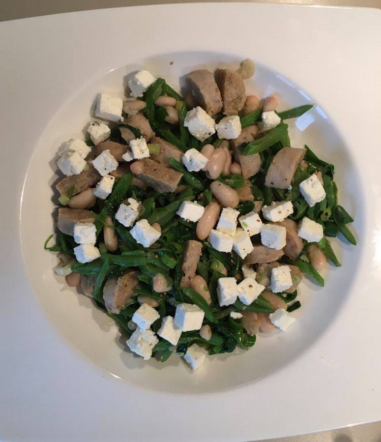 Dans un petit cul de poule, mélanger les feuilles de roquette, le céleri vert, les champignons crus et les noisettes. Y ajouter une ponte de sel et de poivre et une c à s d’huile d’olive. Mélanger.
