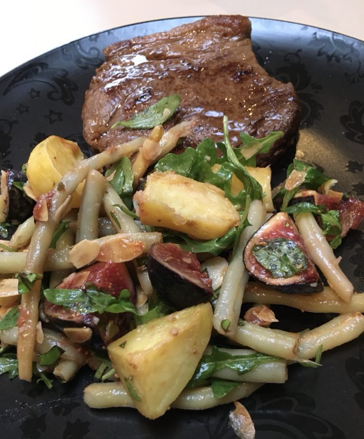 Renato aime bien, à titre personnel, une entrecôte coupée au couteau avec de la ‘colatura di alici’ (produit très fort au goût d’anchois), une très bonne huile d’olive, des câpres au sel dessalés et citron + zeste et pas de parmesan ni de tomate séchée, et encore moins le balsamique.