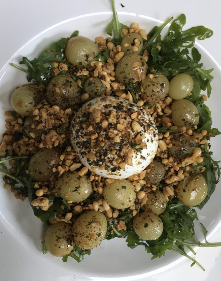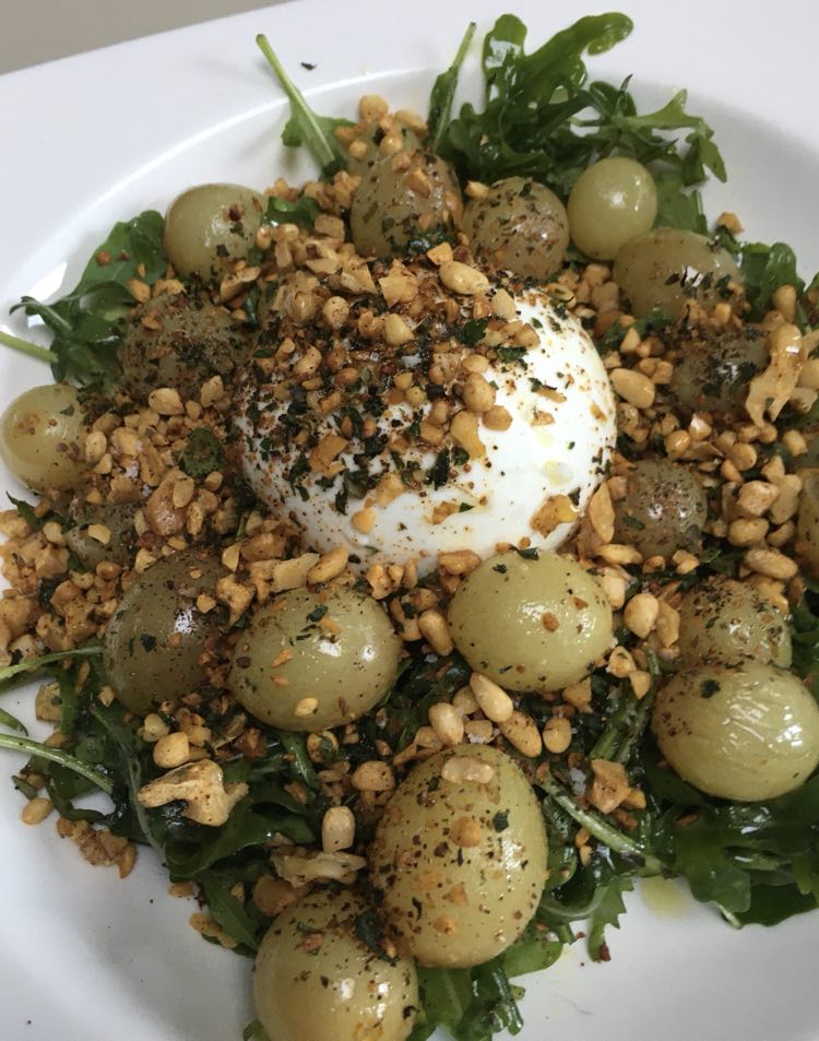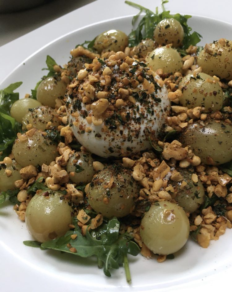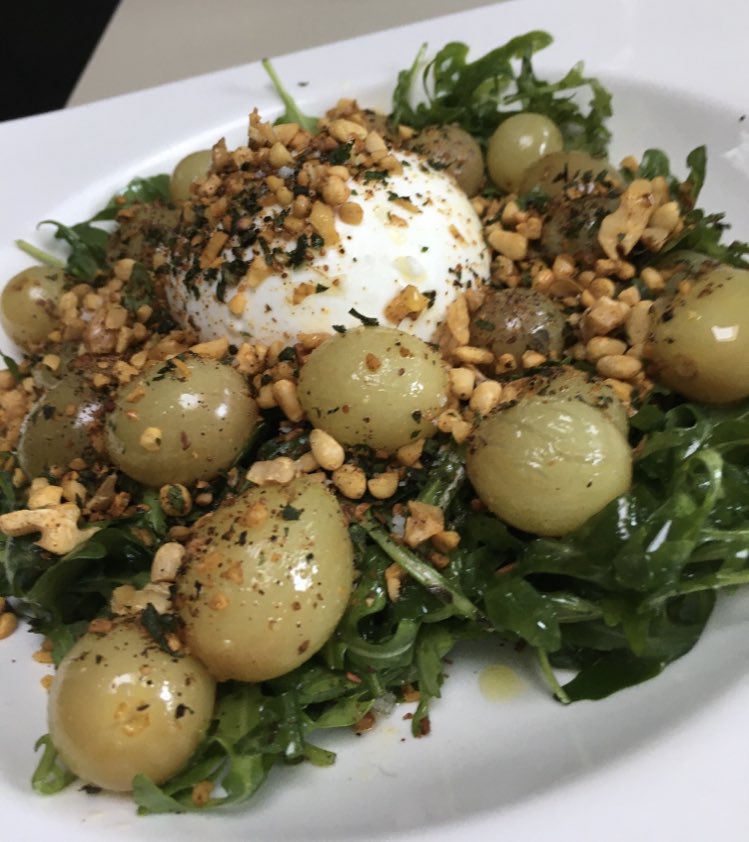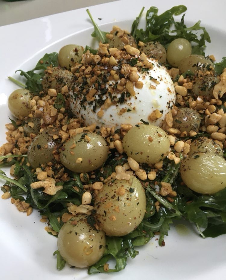 - 300 g de filet de boeuf, sel, poivre, huile d’olive + 25 g de petits câpres et 20 g de mostarda de fruits. Sur le tartare : 100 g stracciatella, 50 g noisettes, 4 filets d’anchois, de la truffe en copeaux, herbes et 5 cl de sauce aux anchois. Pour la sauce : faire cuire 3 gousses d’ail dans 200 ml de lait à petits bouillons jusque quand l’ail devient très tendre. Ajouter 50 g d’anchois et cuire jusque quand ça devient crémeux. Mixer pour obtenir une sauce lisse.