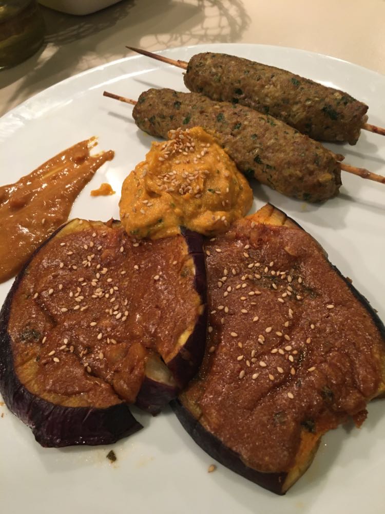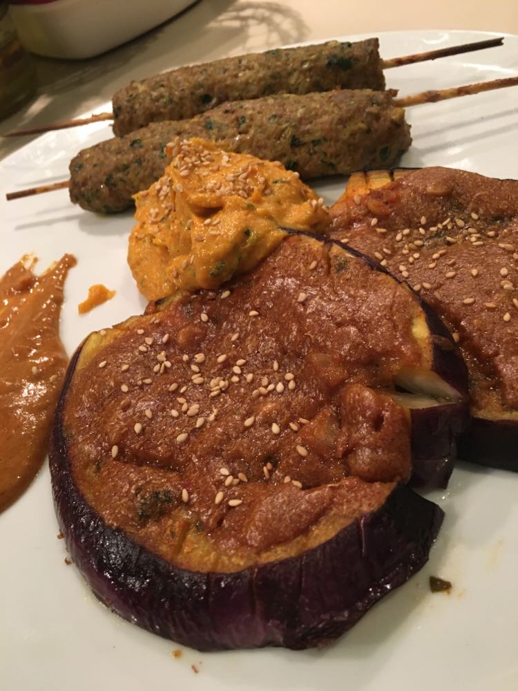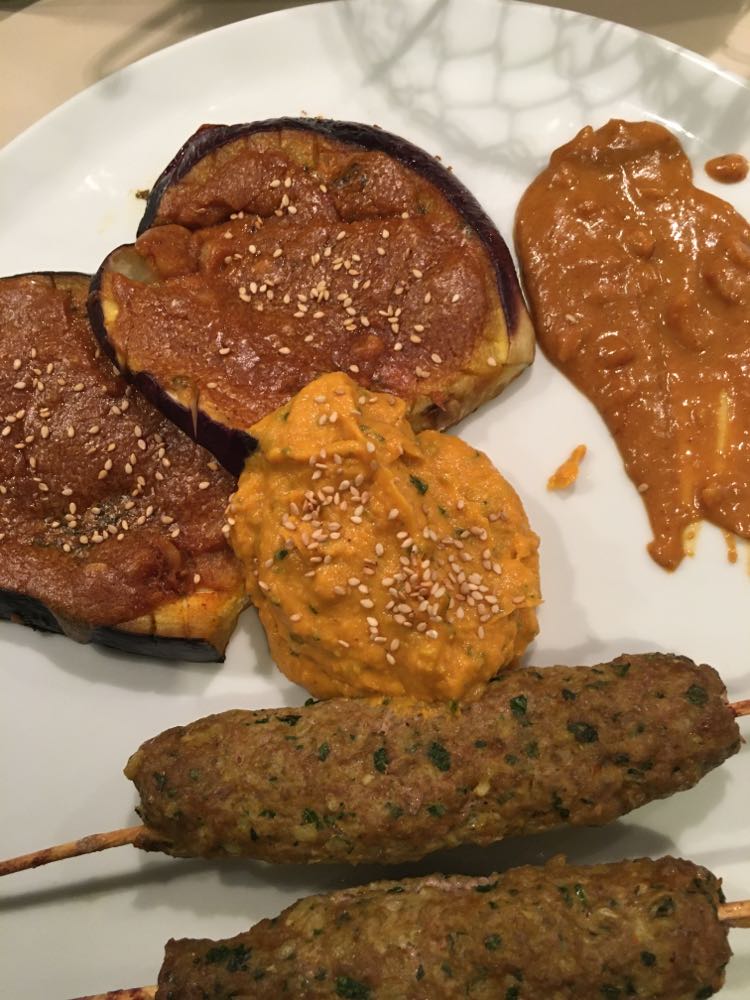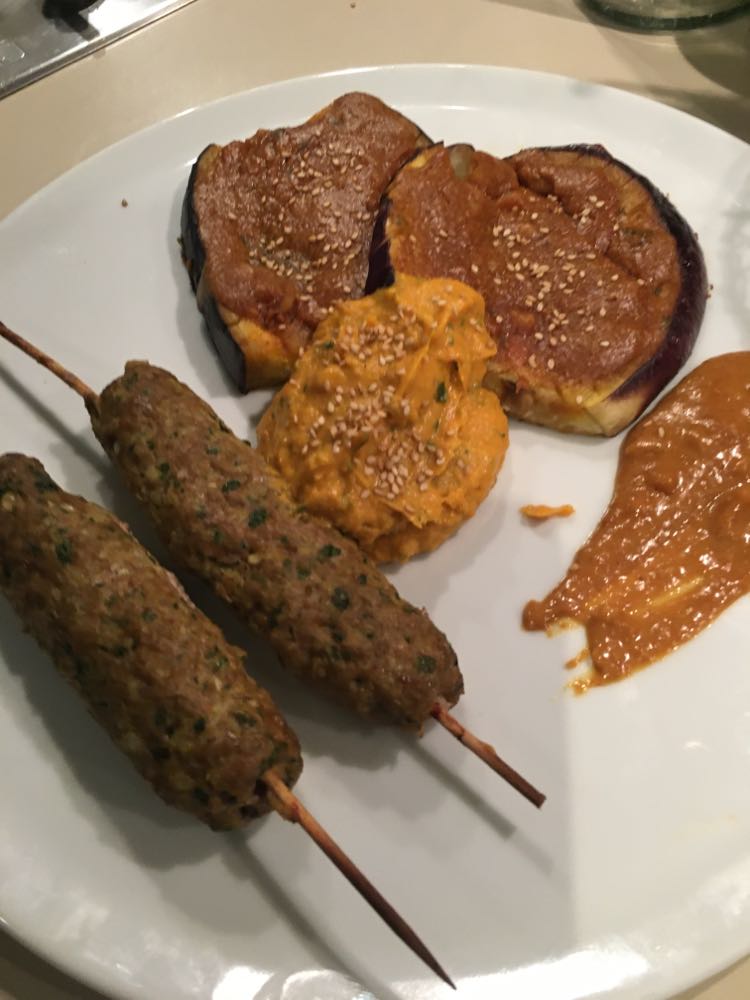 AUBERGINES A LA SAUCE SATAY, PUREE DE PATATES DOUCES FACON ‘BABA GANOUSH’ ETBROCHETTES KEFTA PORC/BOEUF