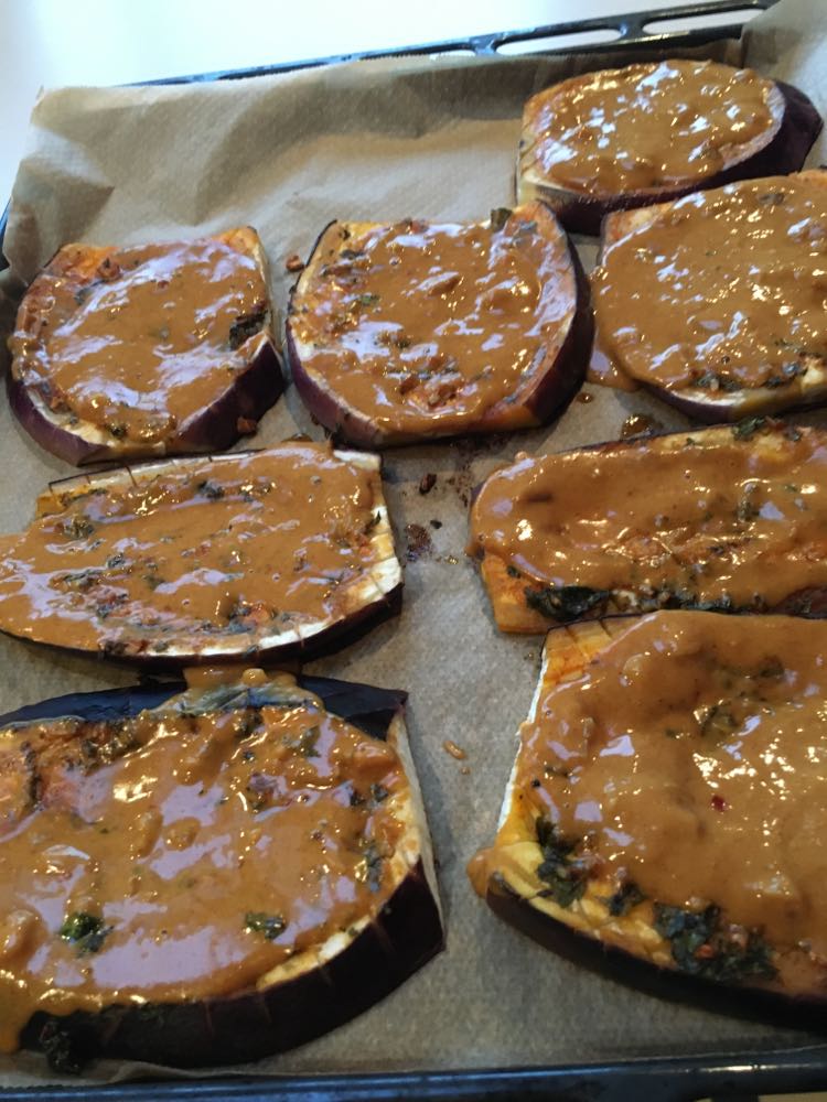 Deux grosses aubergines ‘viola’ (rondes) et un reste de sauce Satay au surgélateur et l’inspiration à fait le reste. L’amertume assez neutre de l’aubergine est réveillée avec la sauce Satay et l’association aubergine et patate douce fonctionne trop bien.